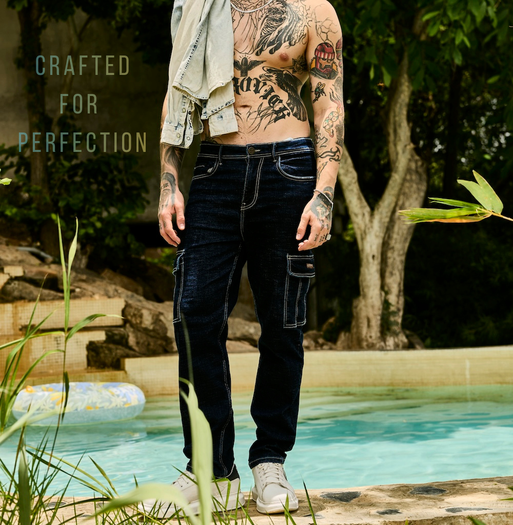 Dark Blue Faded Cross Hatch Cargo Fit Jeans