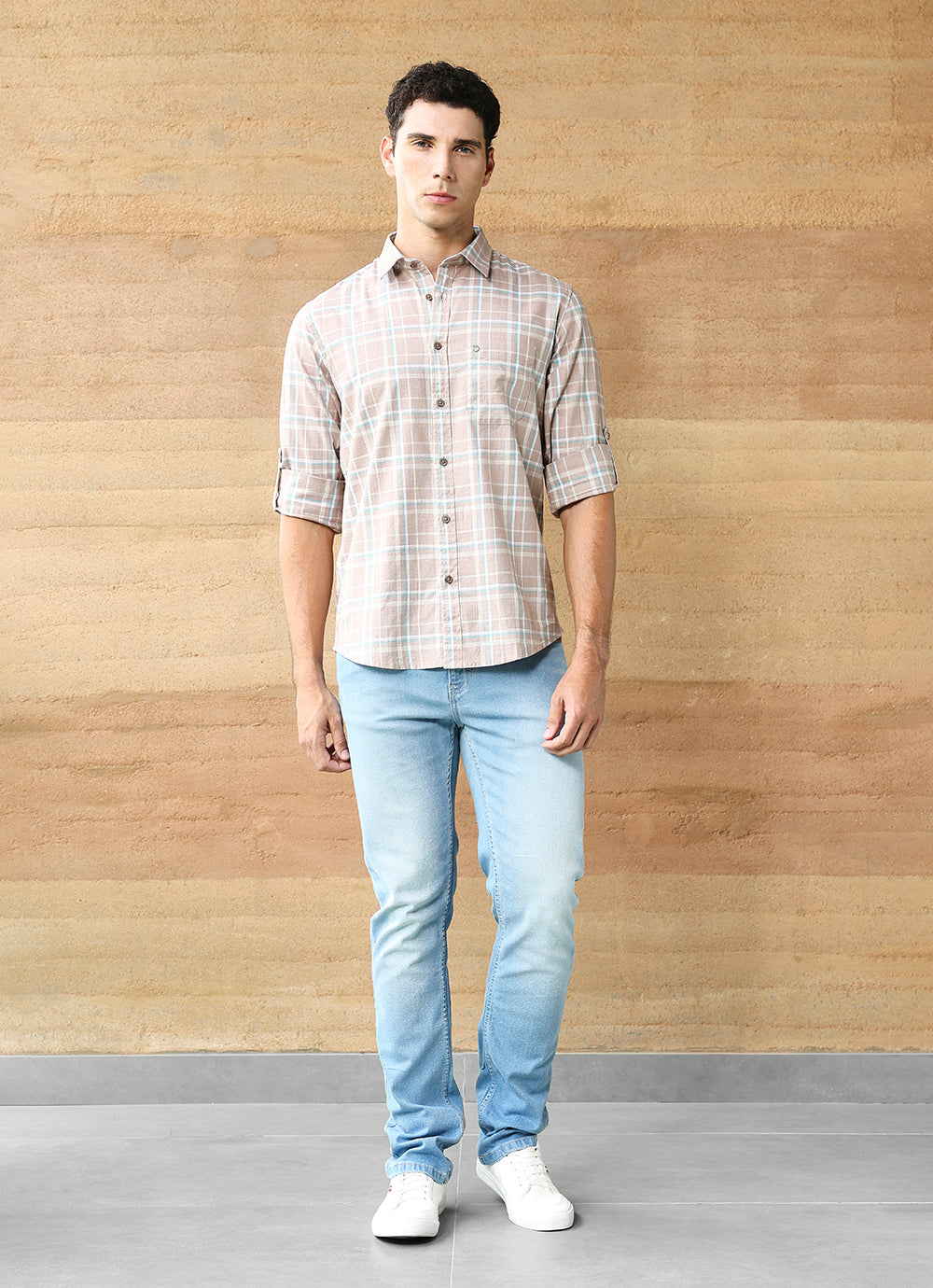 Crafted from soft, breathable cotton, this shirt features a muted brown base with pastel blue and white checks, offering a refined take on everyday checks. The slim fit cut ensures a sharp silhouette, while the fabric’s natural comfort makes it perfect for all-day wear.