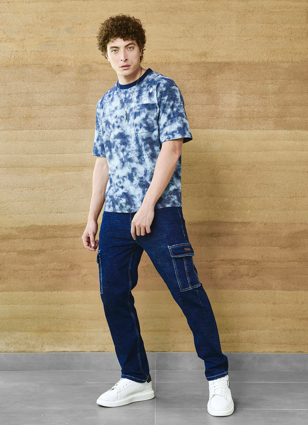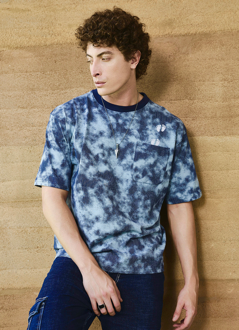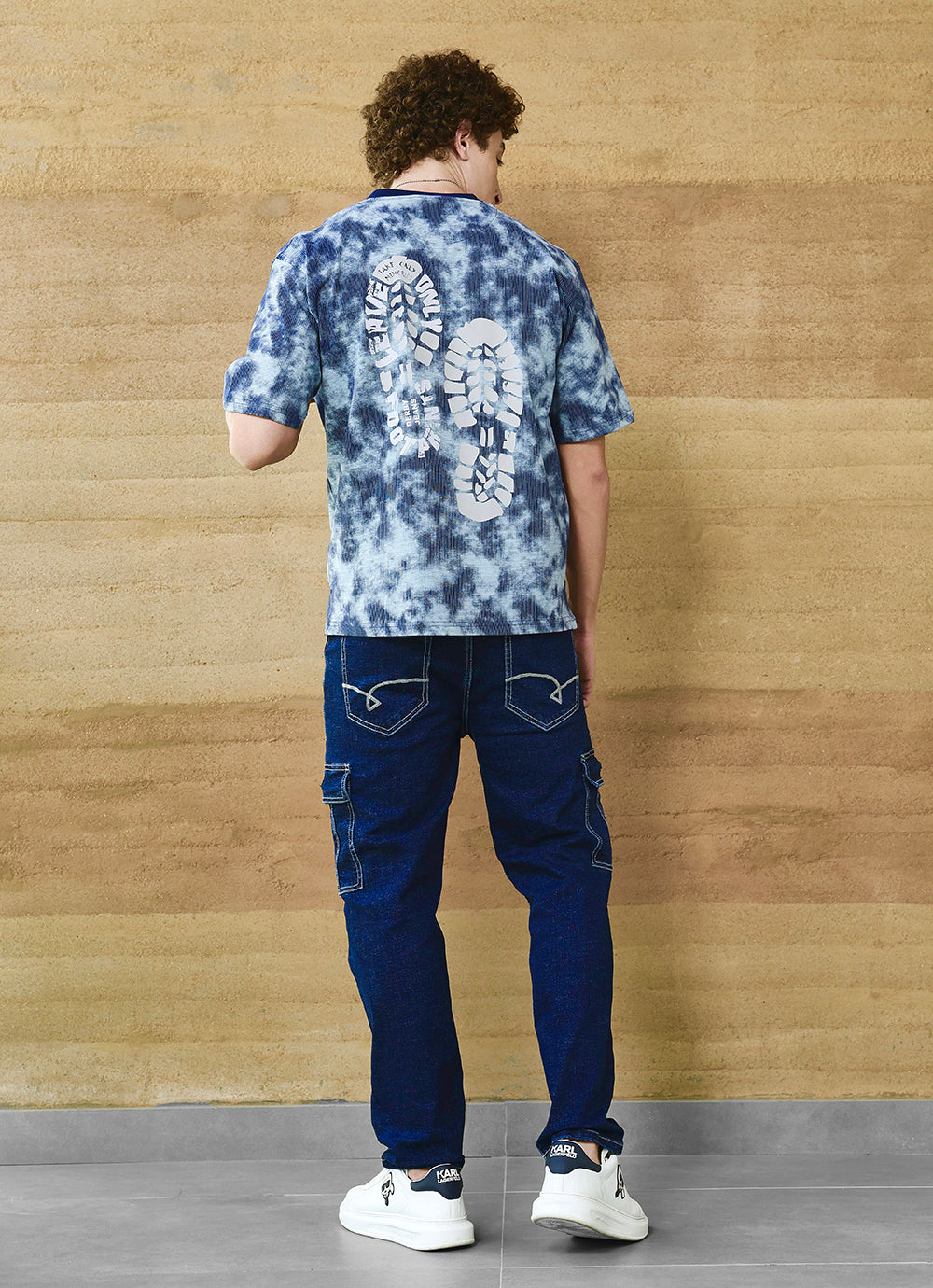 This Navy Round Neck Cotton Oversized Fit T-shirt blends comfort with a bold, modern look. Made from soft cotton, it features an abstract tie-dye-inspired pattern in navy tones, giving it a contemporary streetwear appeal. The oversized fit ensures relaxed styling, perfect for casual outings.