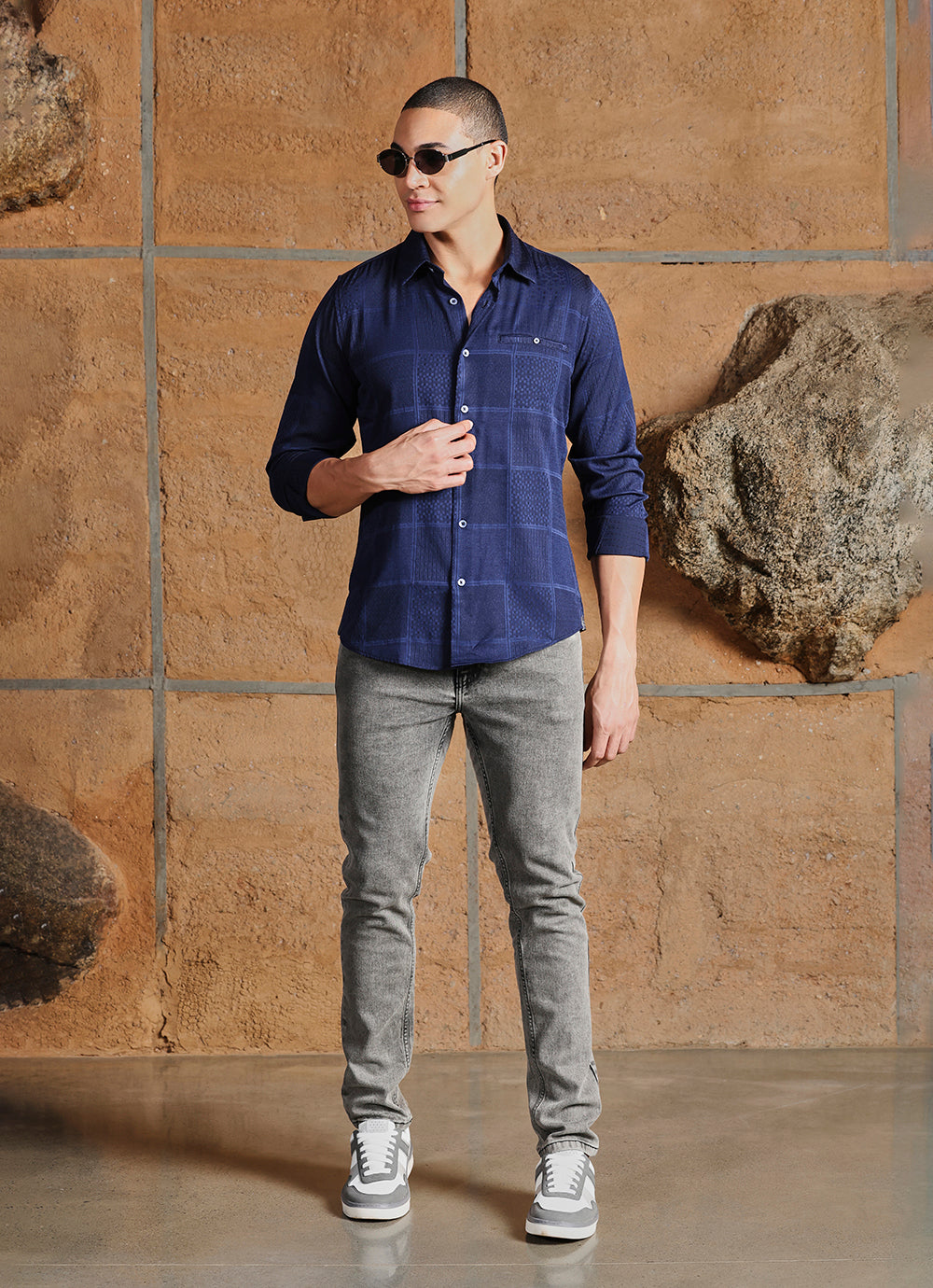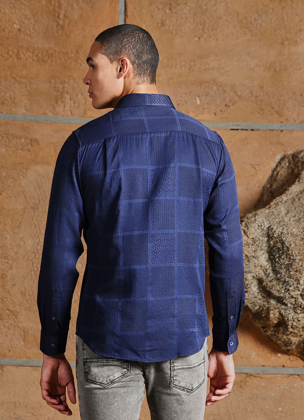 Navy Print Cotton Jacquard Slim Fit Shirt