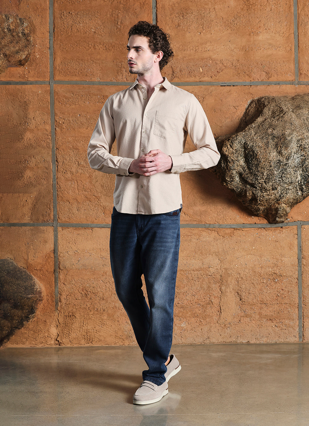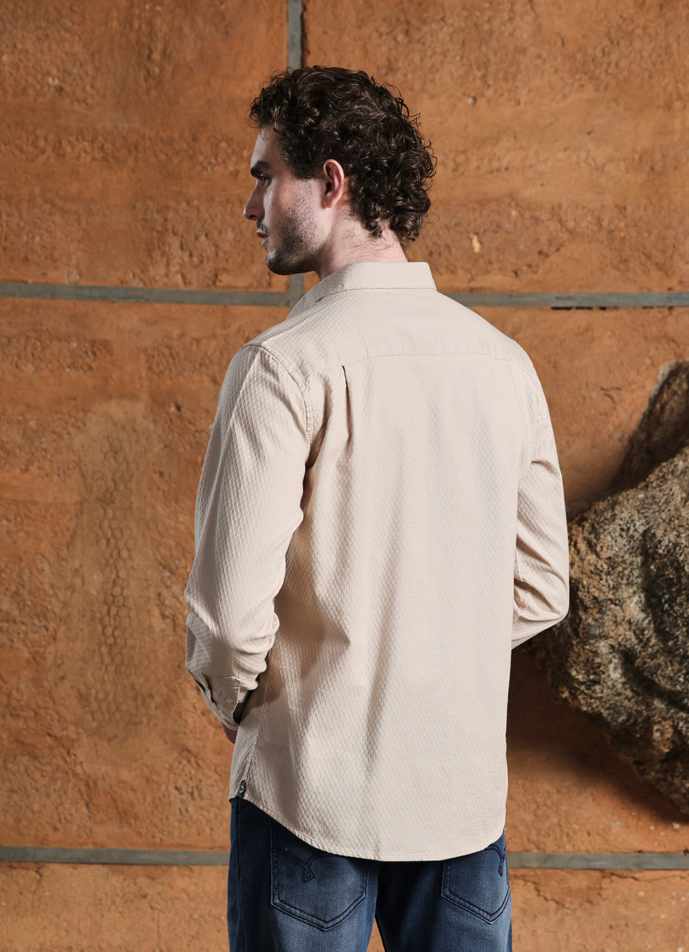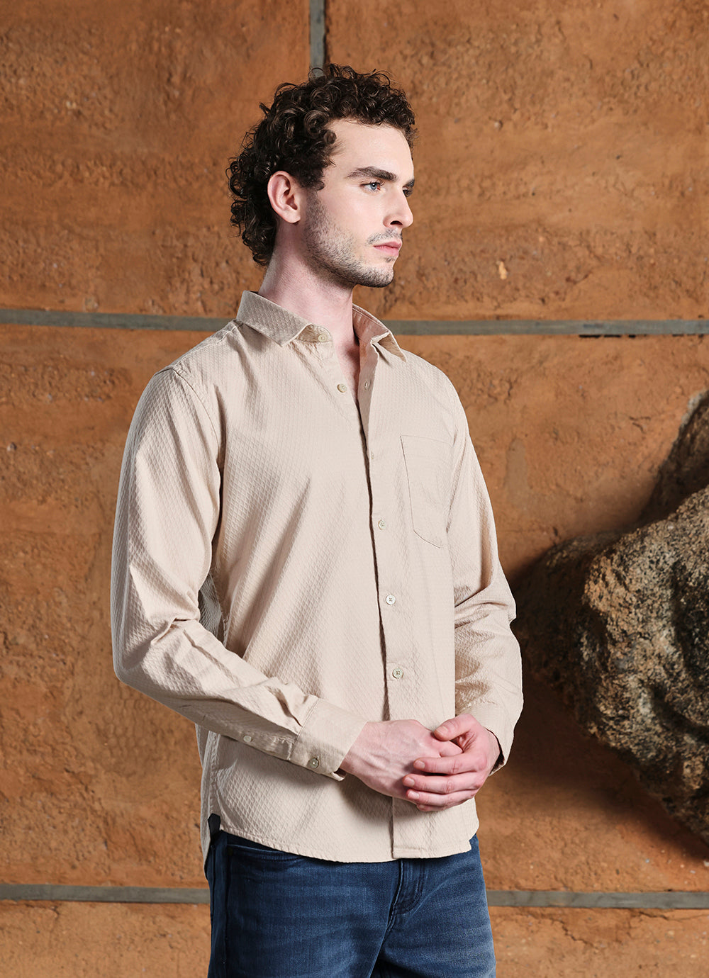 Step into understated elegance with this Beige Solids Cotton Slim Fit Shirt. Designed from soft, breathable cotton, it offers all-day comfort while maintaining a sharp, tailored silhouette. The neutral beige tone makes it a versatile wardrobe staple, pairing seamlessly with both formal trousers and casual denim. Subtle textured detailing adds just the right amount of sophistication, making it suitable for every occasion.