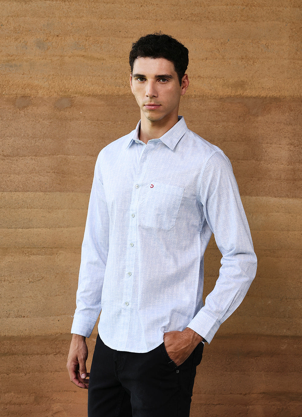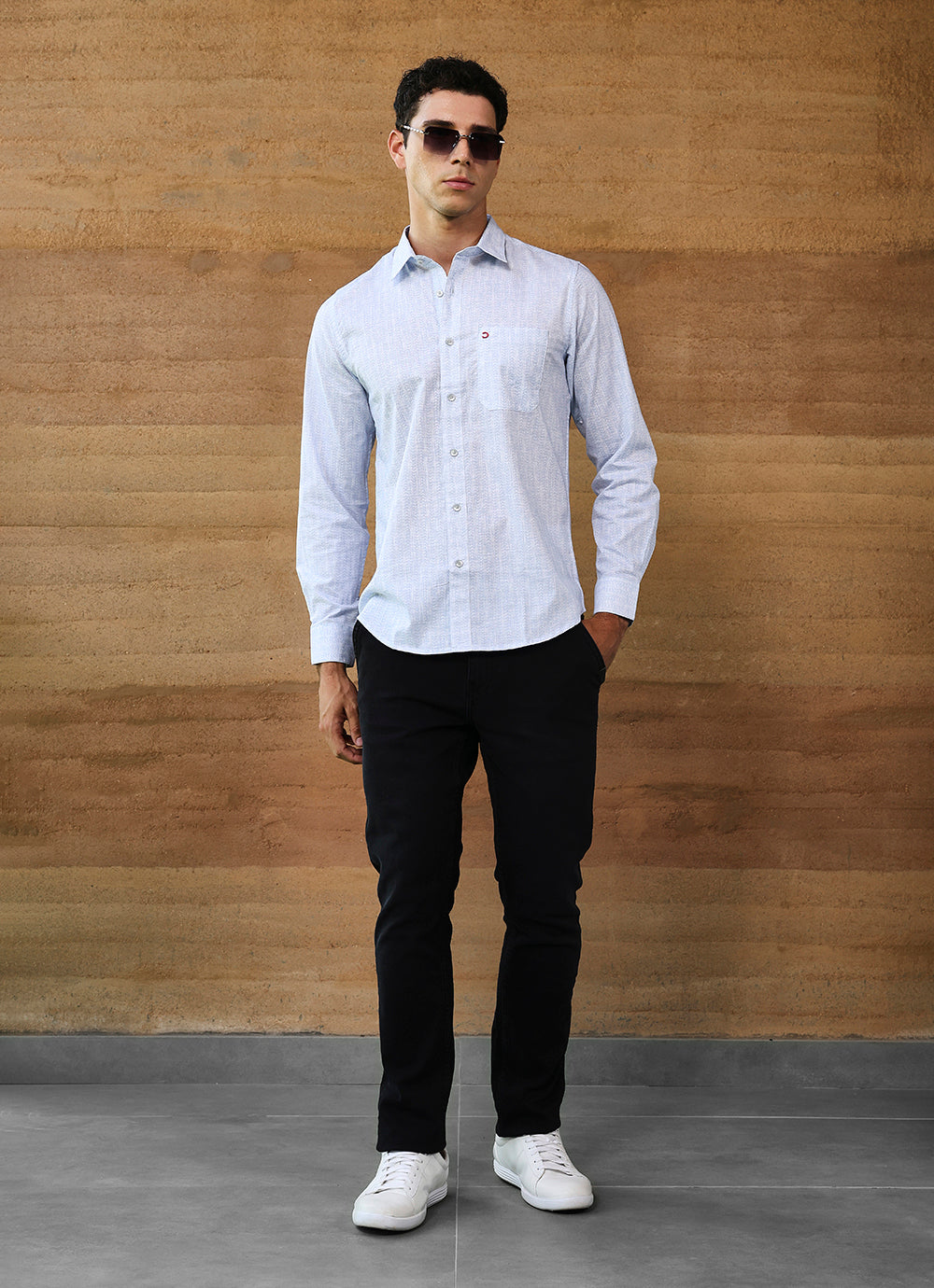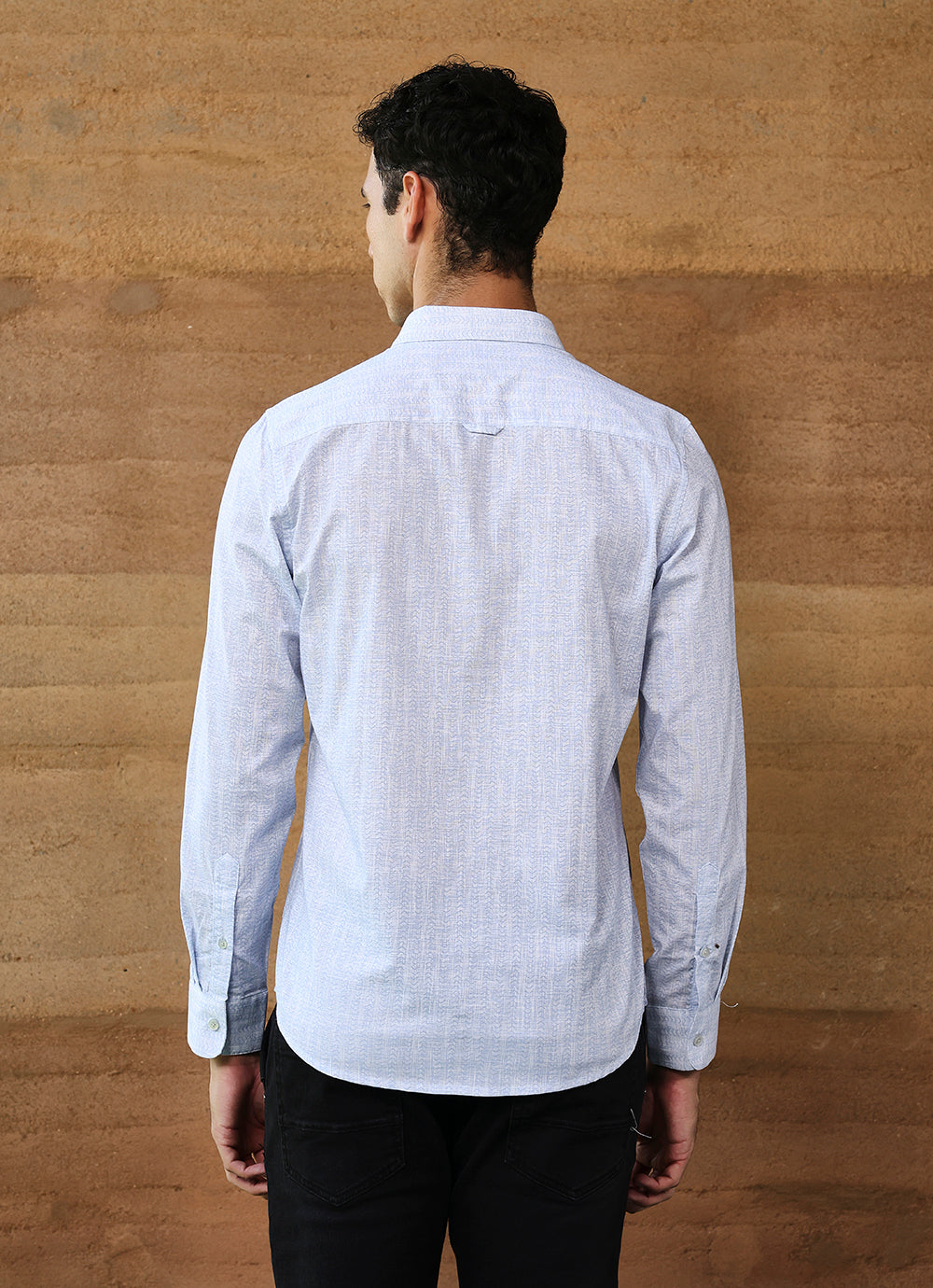 Elevate your everyday look with this Blue Print Cotton Slim Fit Shirt. Crafted from soft cotton, it features a subtle all-over print in tonal shades that adds refined texture without overwhelming the clean blue base. The slim fit cut offers a modern, tailored silhouette, while the button-down front and chest pocket keep it effortlessly versatile for both casual and semi-formal occasions.