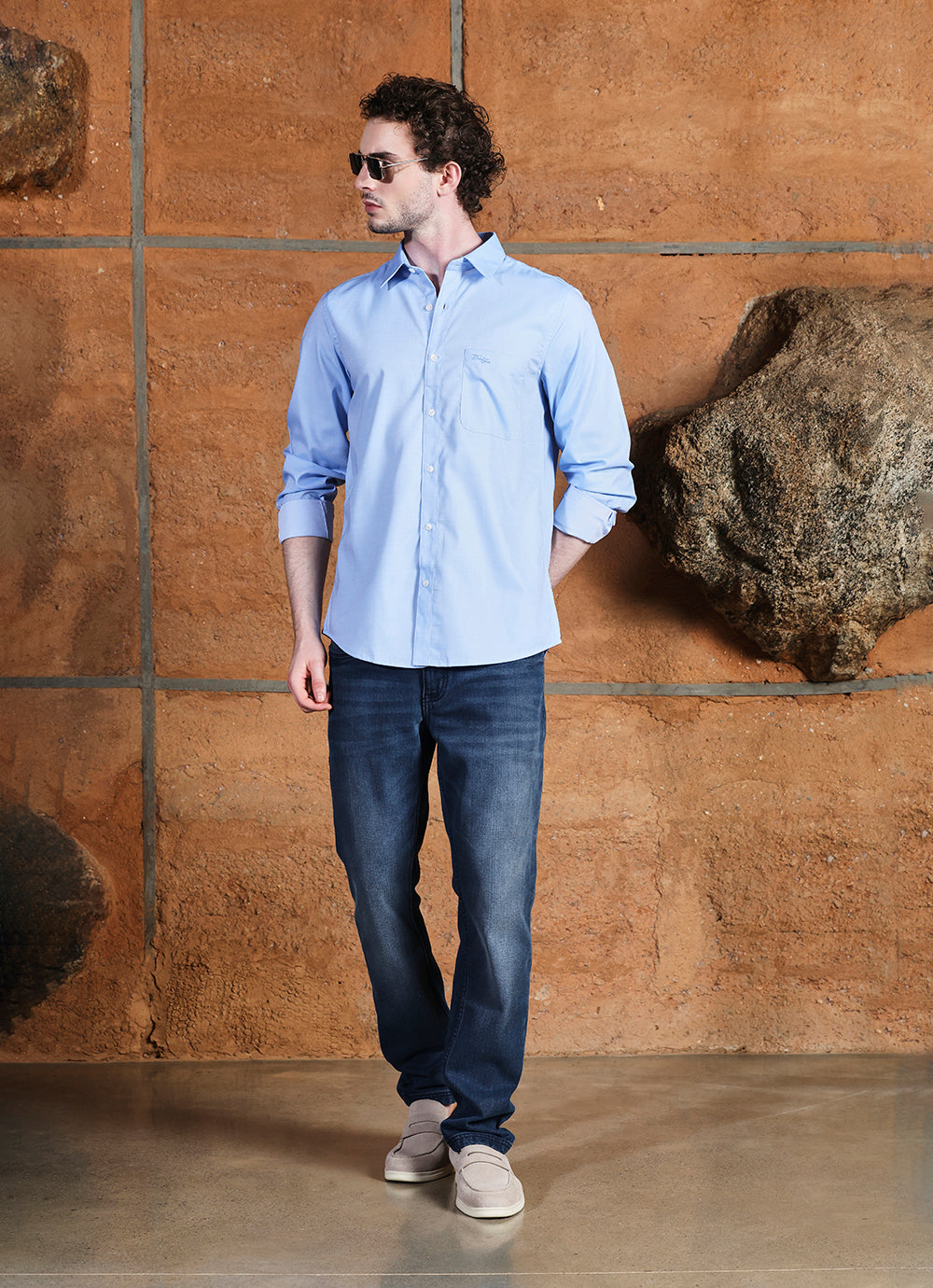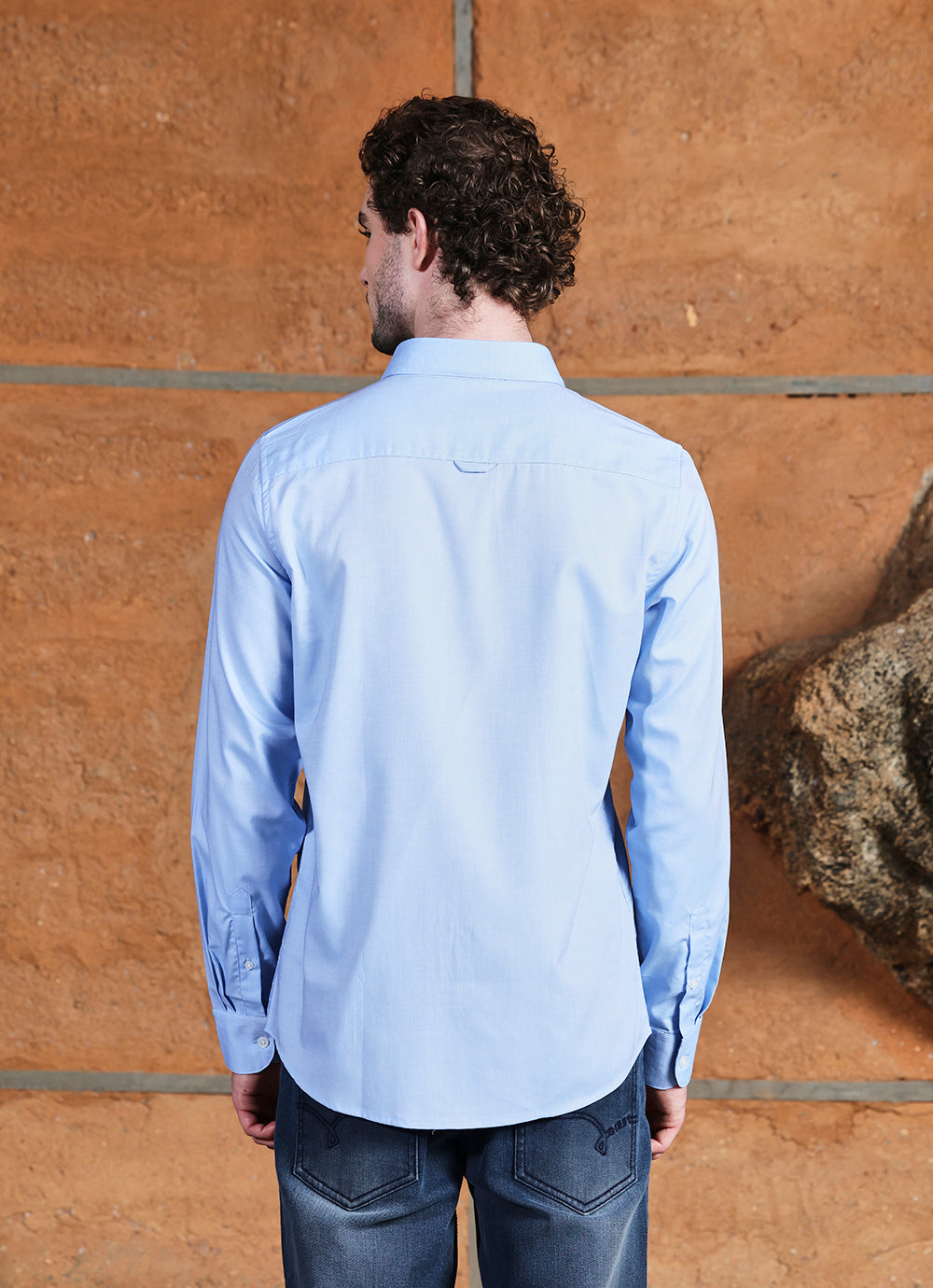 Timeless elegance meets modern tailoring. This sky-blue cotton shirt brings a polished edge to your wardrobe with its clean lines and sharp slim fit. A true essential that pairs effortlessly with trousers or denim.