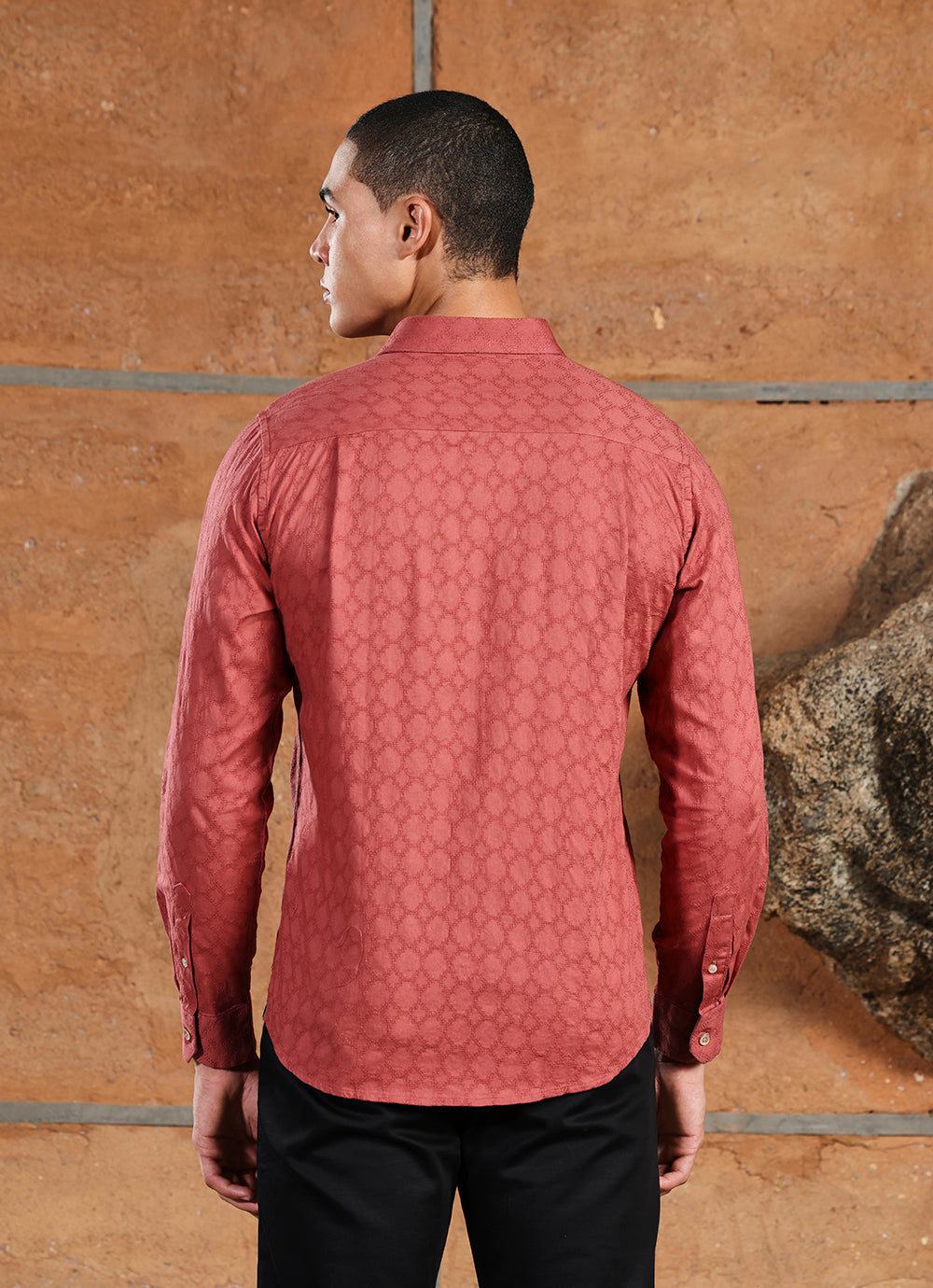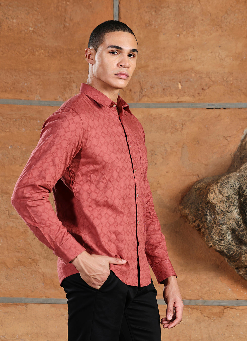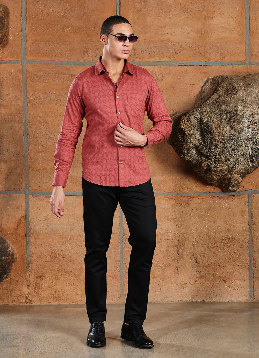 Make a bold yet refined statement with this Brick Solids Cotton Slim Fit Shirt. The rich brick tone exudes warmth and confidence, while the subtle woven texture adds depth and character without overpowering the look. Tailored in breathable cotton with a streamlined silhouette, it balances everyday ease with modern sophistication.