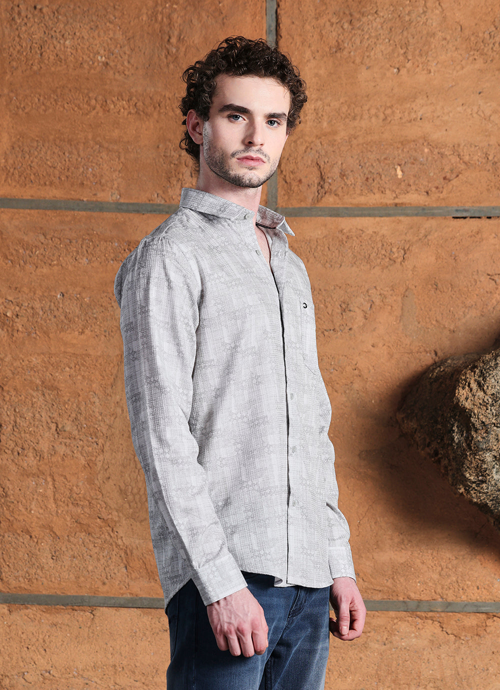 The Grey Print Cotton Slim Fit Shirt is a modern staple designed for effortless style. Crafted from soft, breathable cotton, this slim-fit shirt offers all-day comfort while maintaining a polished silhouette. The subtle printed pattern adds a contemporary touch, making it perfect for both casual and semi-formal occasions.