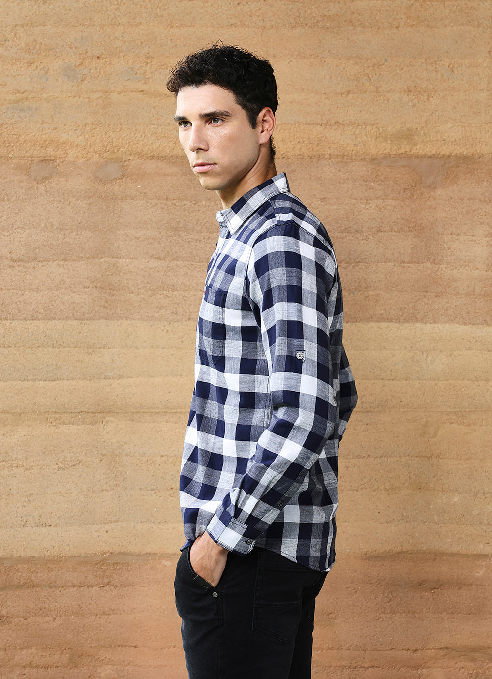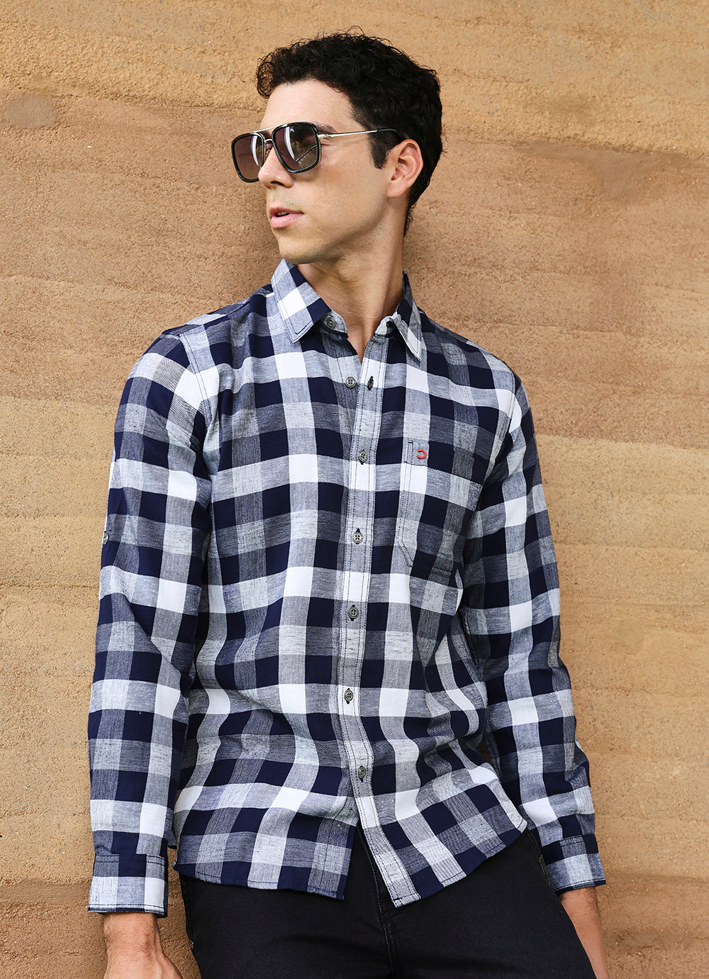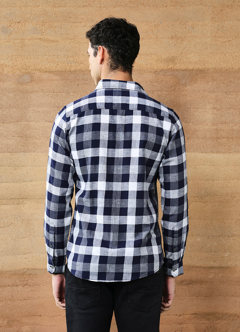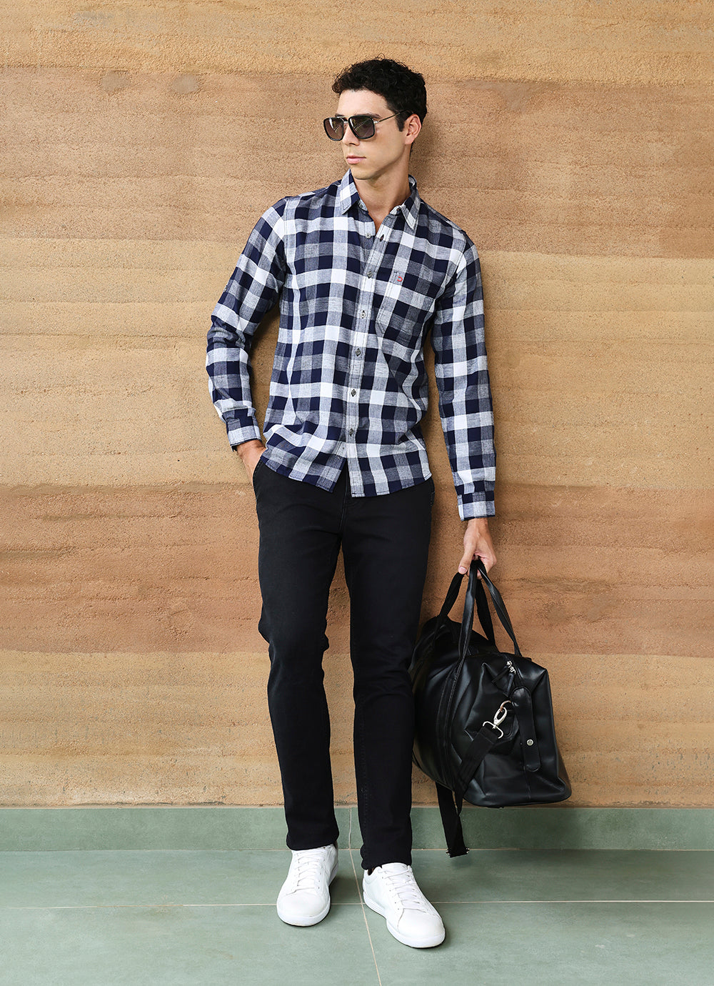 The Indigo Checks Indigo Slim Fit Shirt is a modern classic featuring a bold navy and white check pattern that adds a casual yet sophisticated touch. Crafted from premium cotton fabric, it offers breathability and comfort throughout the day. Designed with a slim fit silhouette, a classic collar, button placket, and a chest pocket with logo embroidery, this shirt combines timeless style with contemporary detailing.