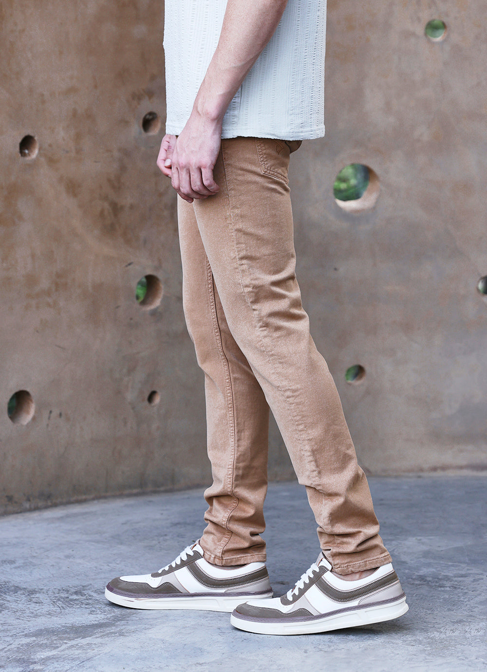 A refined essential, these khaki jeans are tailored from a knitted denim blend that combines the durability of jeans with the softness and stretch of knitwear. The slim fit delivers a streamlined profile, while the earthy khaki tone lends versatility, making them easy to pair with both casual tees and crisp shirts. The fabric’s natural flexibility ensures comfort without compromising on structure.