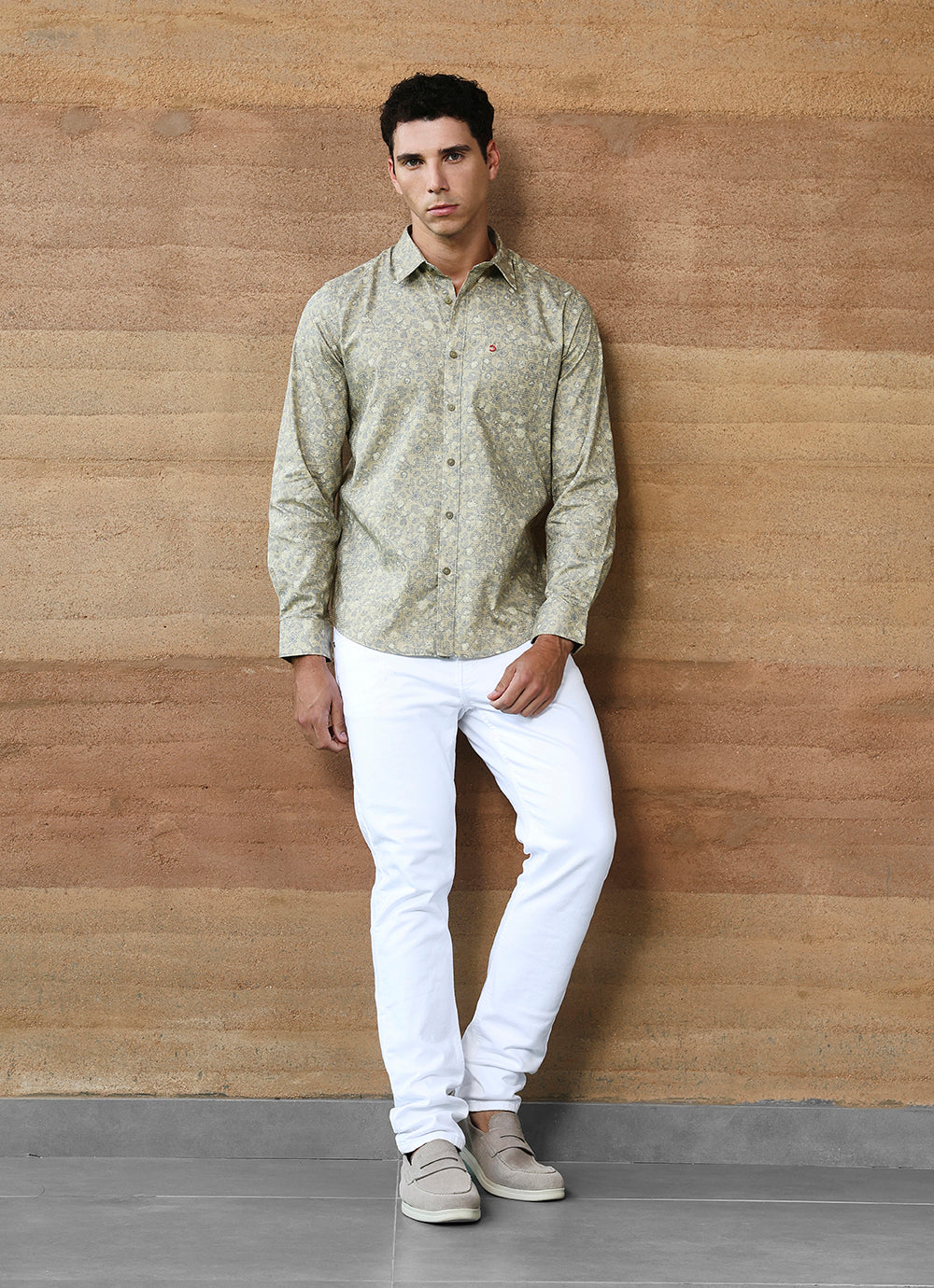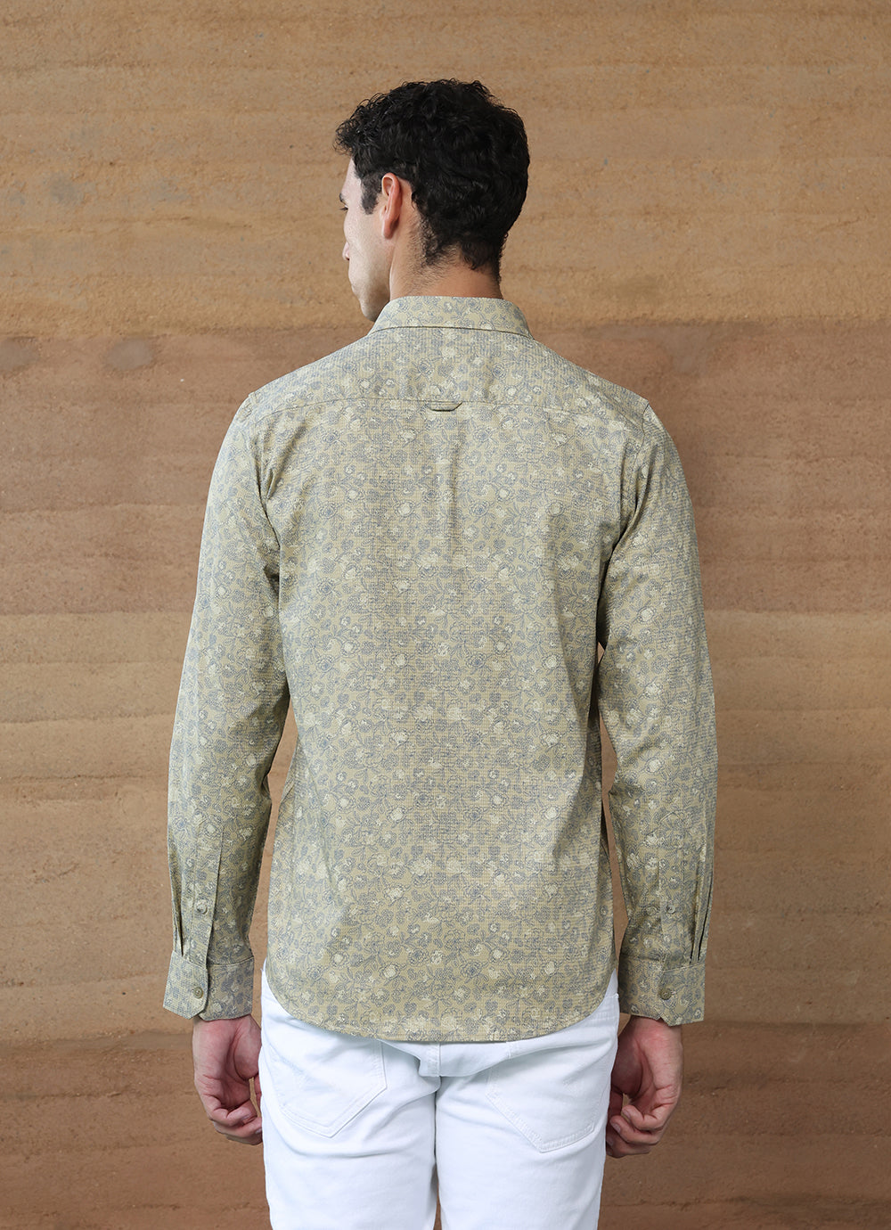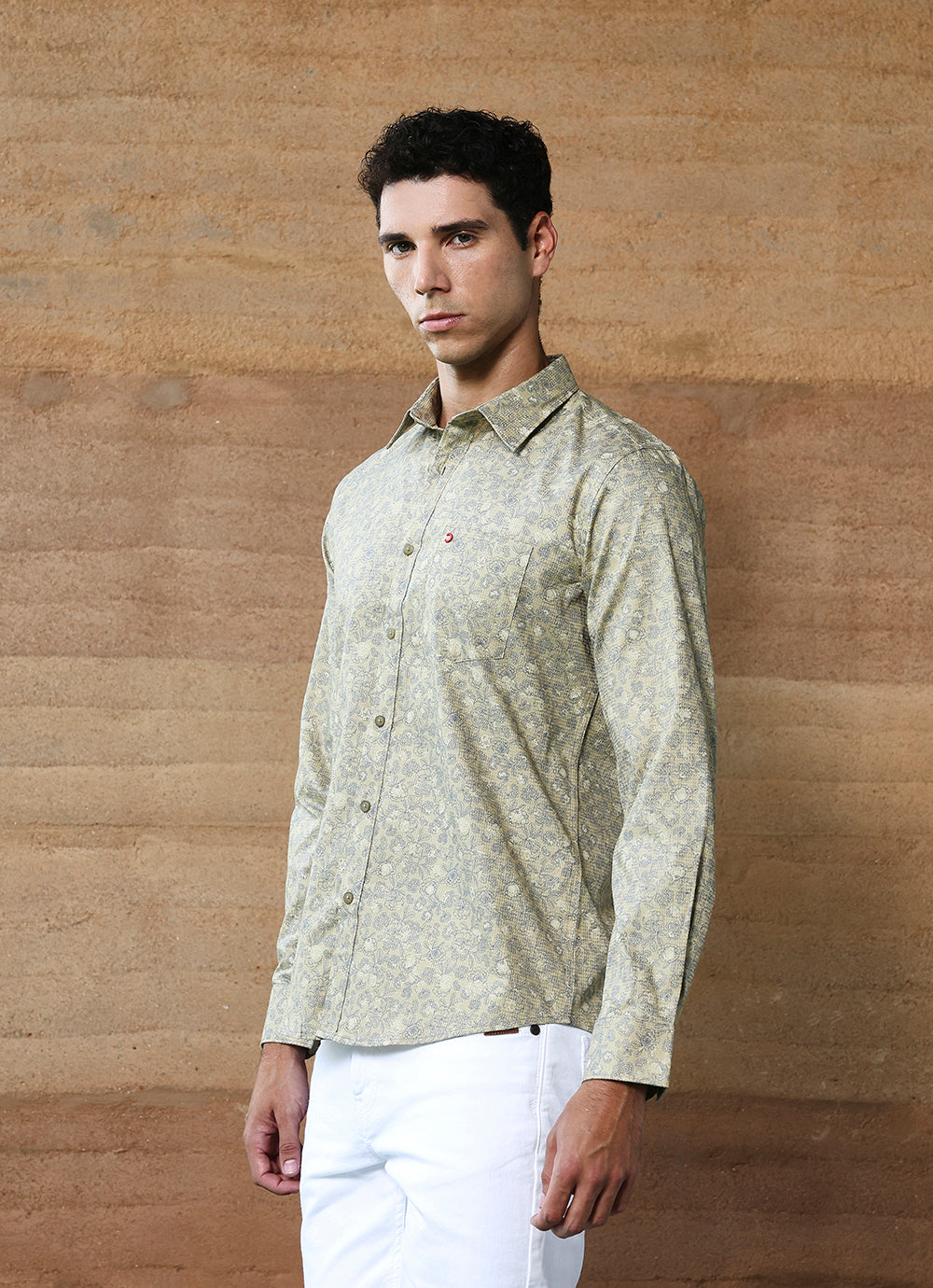 Refresh your wardrobe with this Light Khaki Print Cotton Slim Fit Shirt. Crafted from soft cotton, it features an intricate all-over print in muted tones that balances subtle detail with everyday wearability. The slim fit cut enhances the modern silhouette, while the button-down front and chest pocket add classic shirt styling. Lightweight and versatile, this piece is perfect for both office and casual weekend looks.