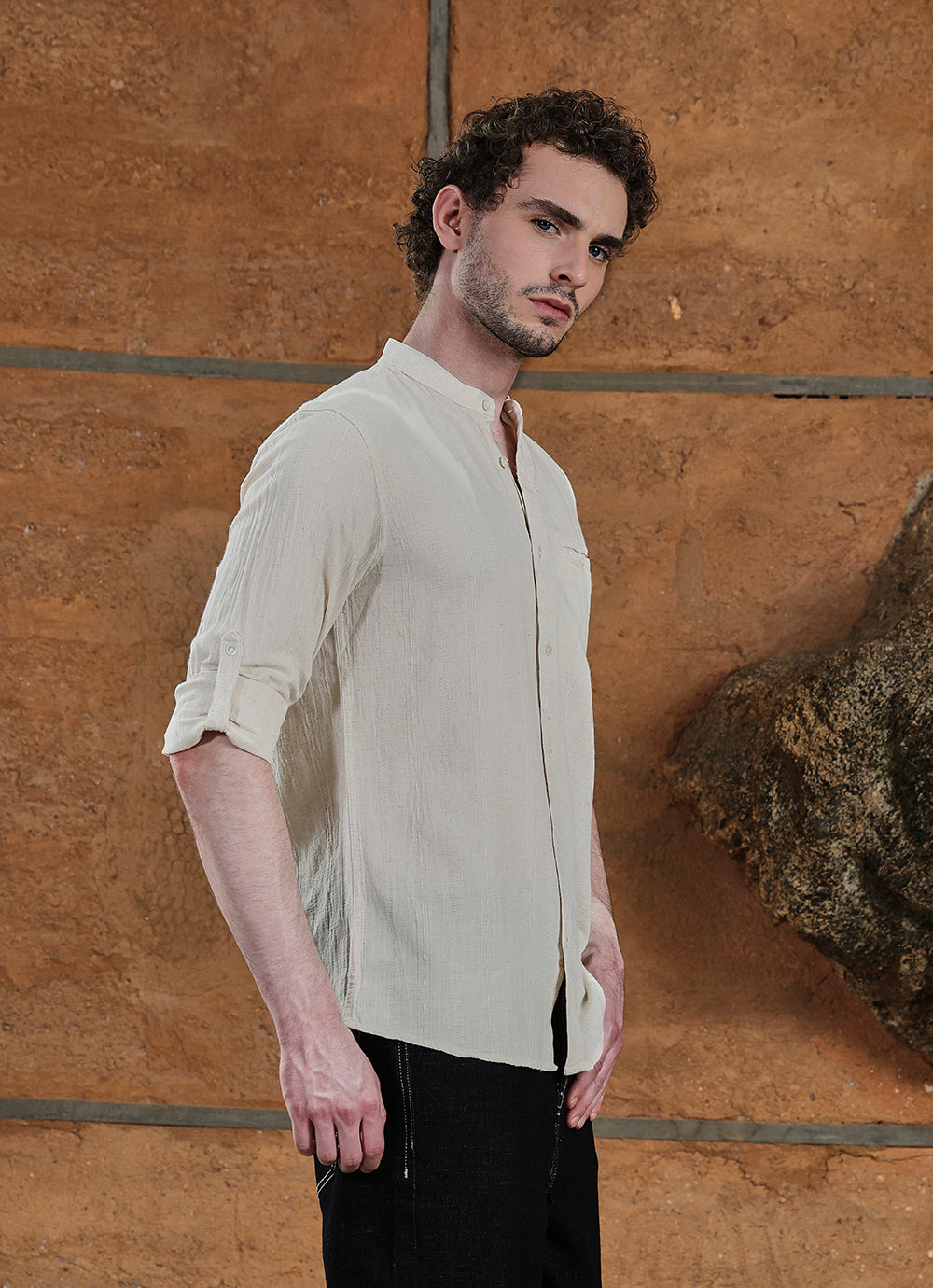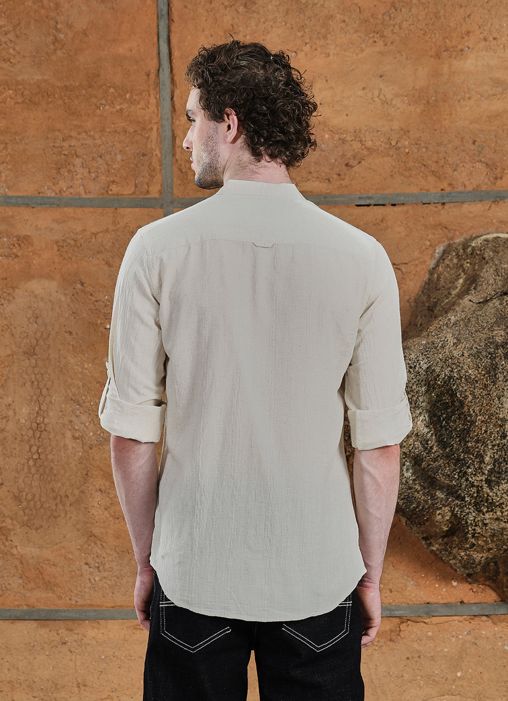Minimal yet refined, this Natural Solids Linen Blend Slim Fit Shirt brings a modern twist to classic tailoring. Crafted from a breathable linen blend, it features a sleek mandarin collar and roll-up sleeves with button tabs, offering both style and versatility. The slim fit ensures a sharp silhouette, while the natural tone adds understated elegance.