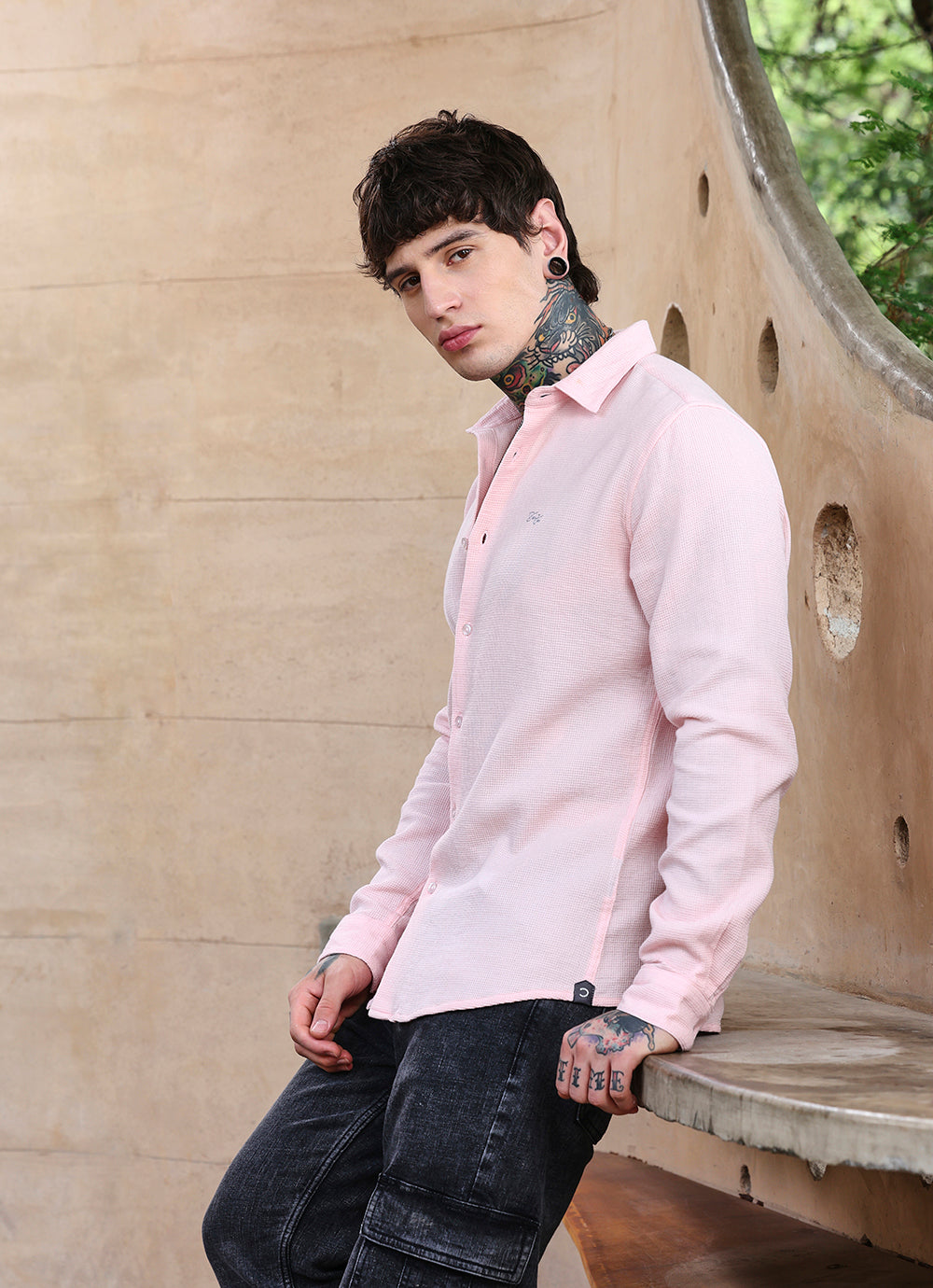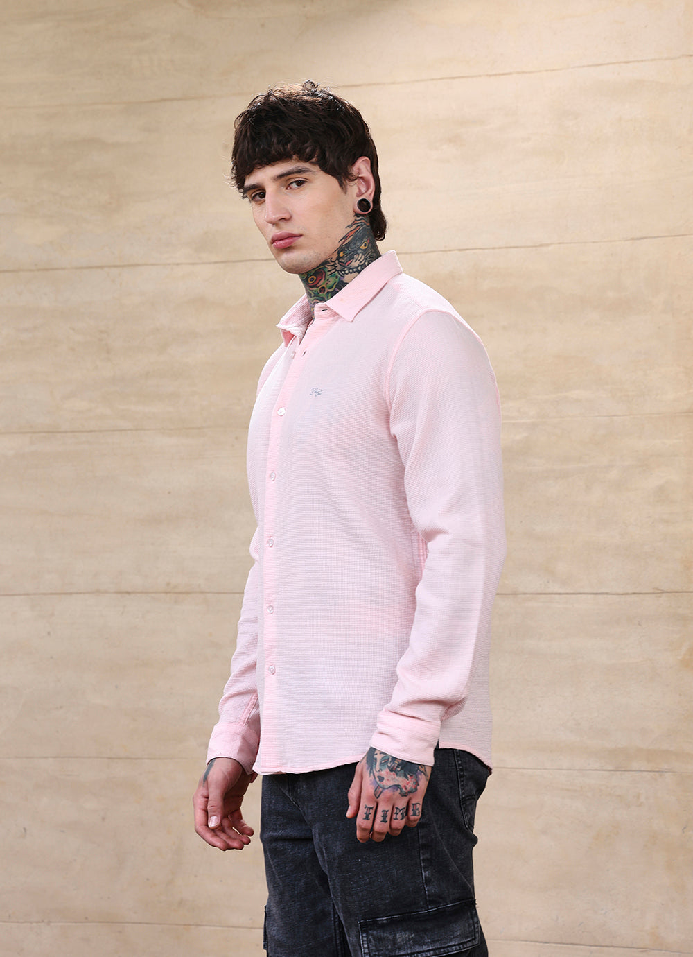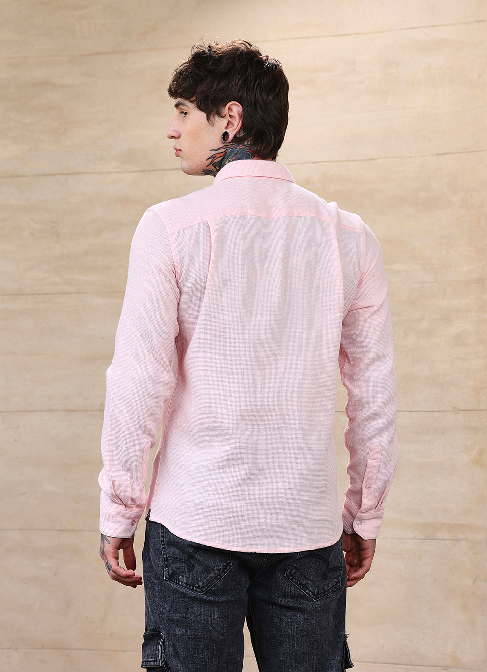 Crafted from fine cotton with a subtle textured weave, this pink slim-fit shirt balances sophistication with ease. The breathable fabric drapes effortlessly, offering all-day comfort while maintaining a sharp, modern silhouette. Its understated elegance makes it equally suited for refined casuals or smart layering.