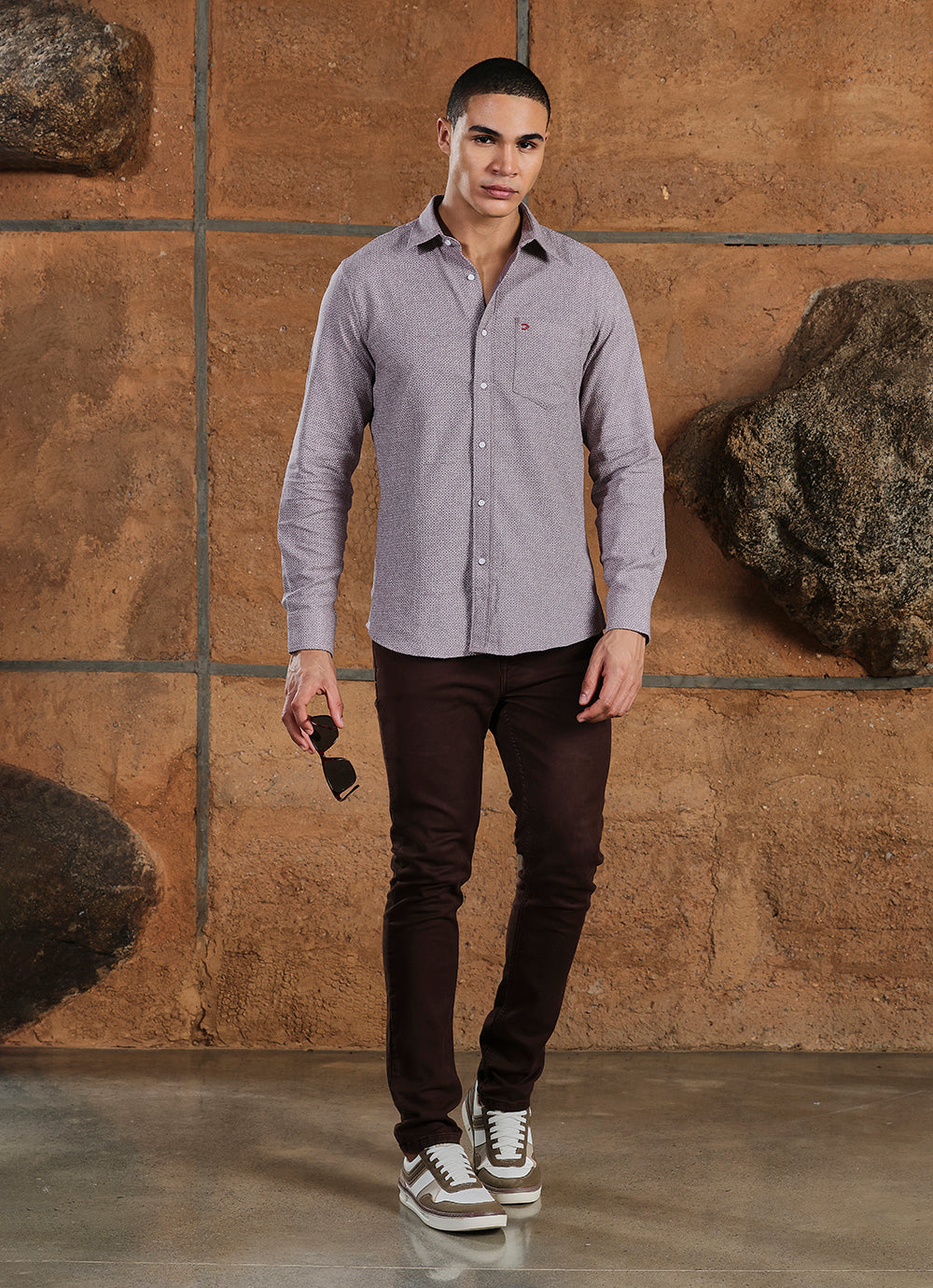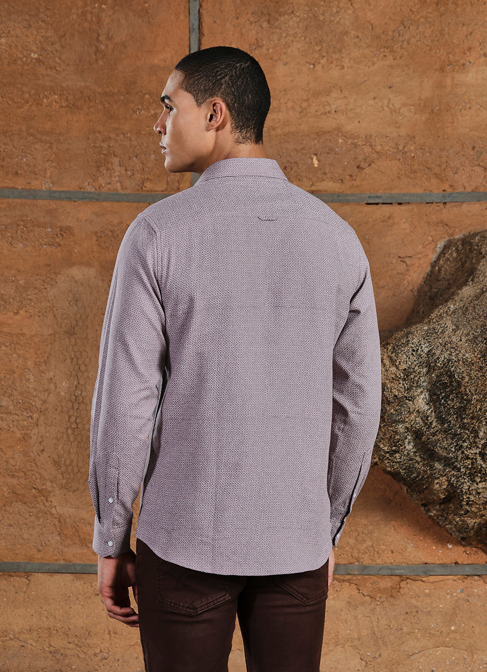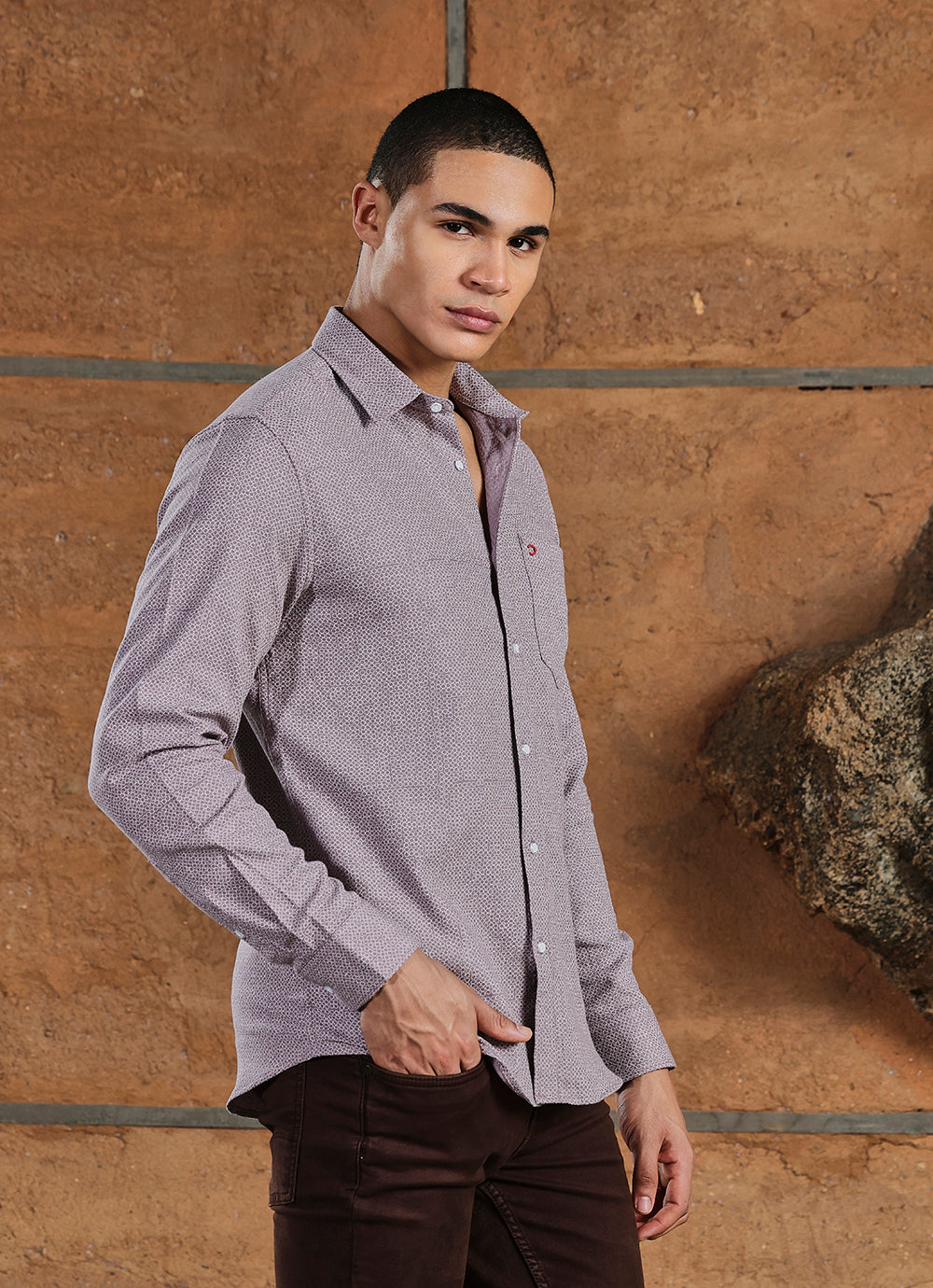 A bold take on refined dressing. This purple slim-fit shirt is enriched with an intricate print that adds depth without being overpowering. Crafted in breathable cotton, it’s designed for men who aren’t afraid to mix sophistication with individuality.