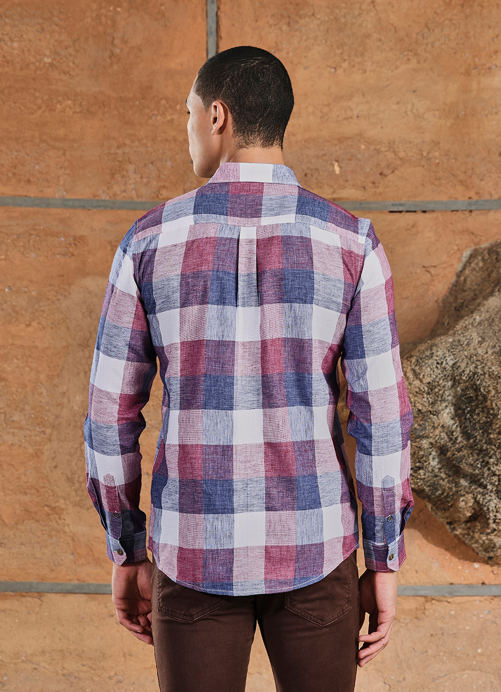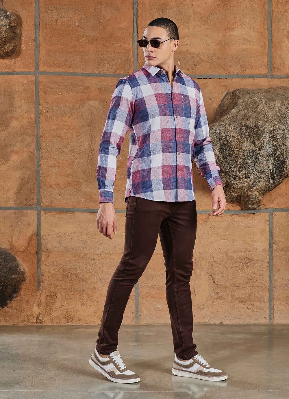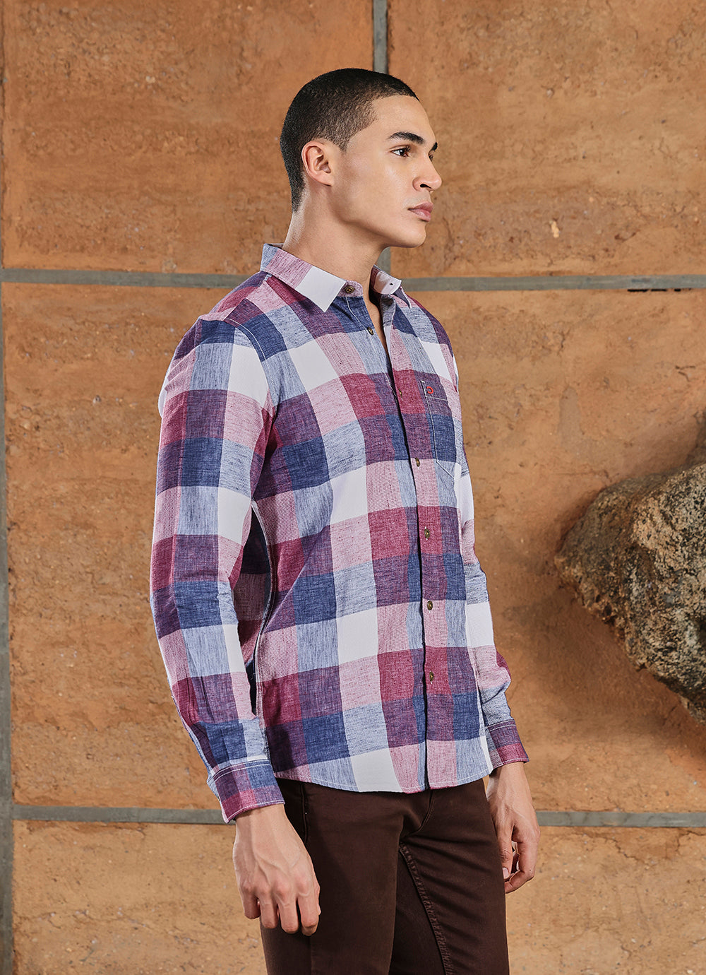 Bold and stylish, this Red Checks Indigo Slim Fit Shirt is designed for the modern man who loves to make a statement. The large checkered pattern in shades of red, indigo, and white brings a refreshing twist to a classic style. Crafted in breathable fabric, it combines comfort with a sharp silhouette.