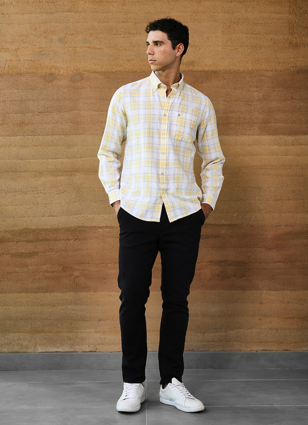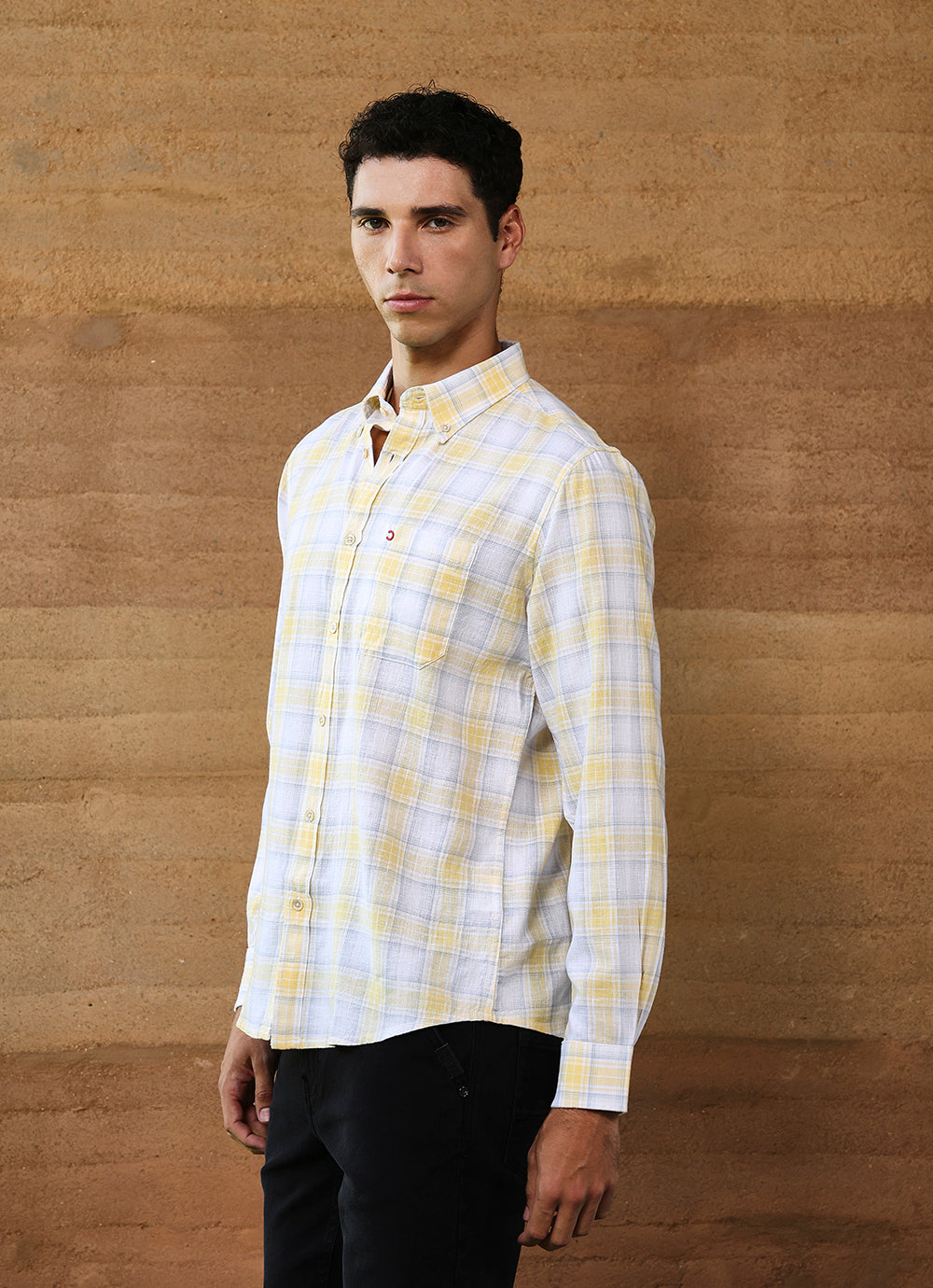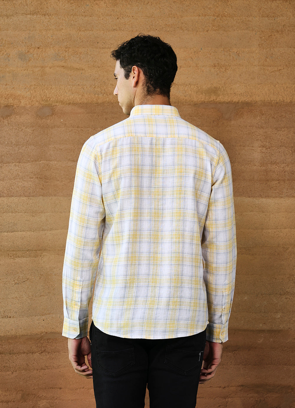 Made from a breathable linen-cotton blend, this shirt offers natural texture and lightweight comfort. Designed in a sunlit yellow and white check pattern, it balances casual vibrance with refined tailoring. The slim fit silhouette keeps the look modern and sharp, perfect for warmer days.