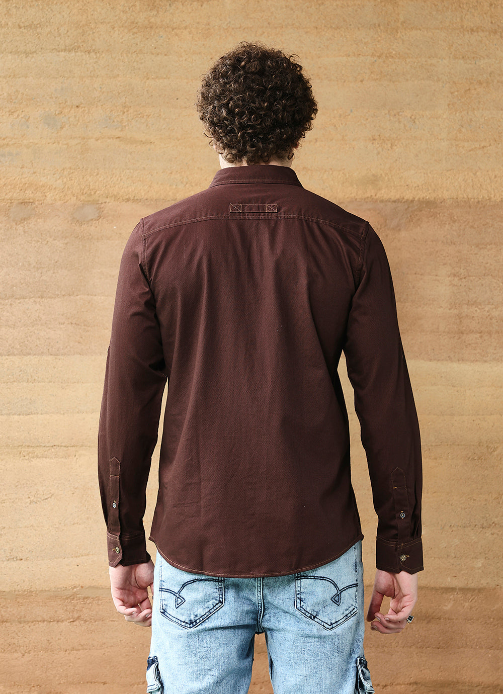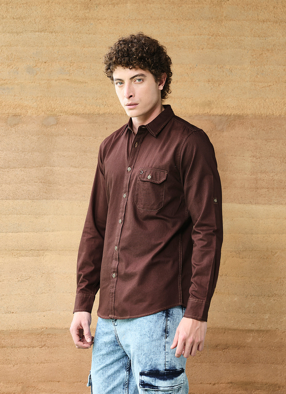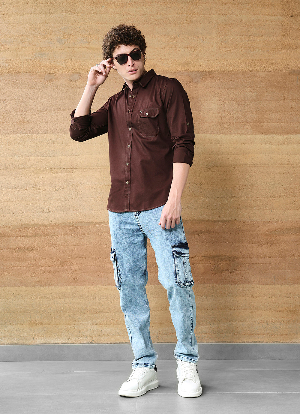 This Brown Solids Coloured Denim Slim Fit Shirt is a rugged yet stylish addition to your wardrobe. Crafted from durable coloured denim, it provides a structured look with a slim fit cut that enhances your frame. Featuring a buttoned chest pocket and roll-up sleeve tabs, it’s designed for both utility and fashion.