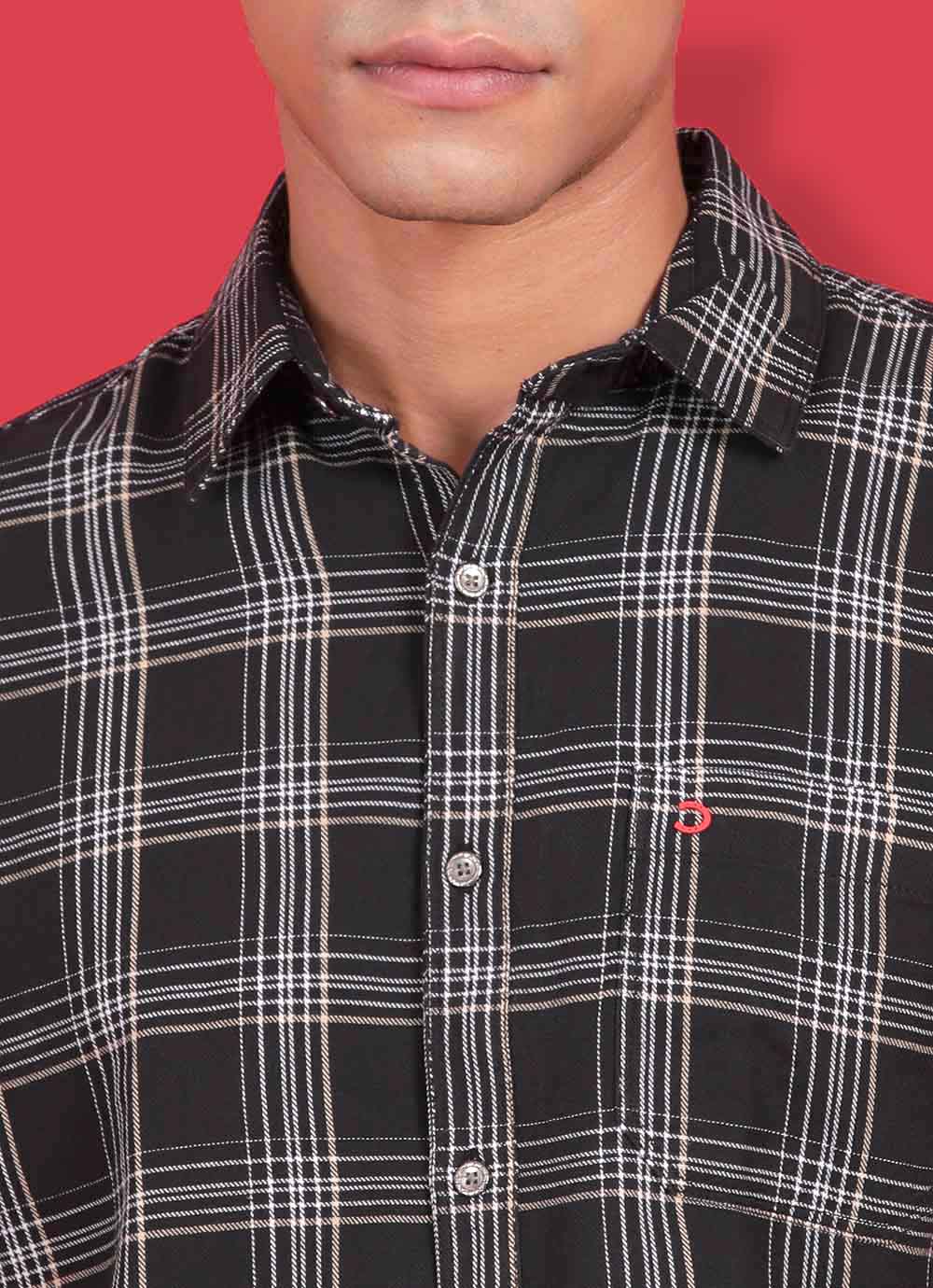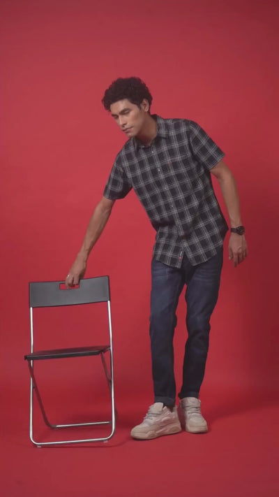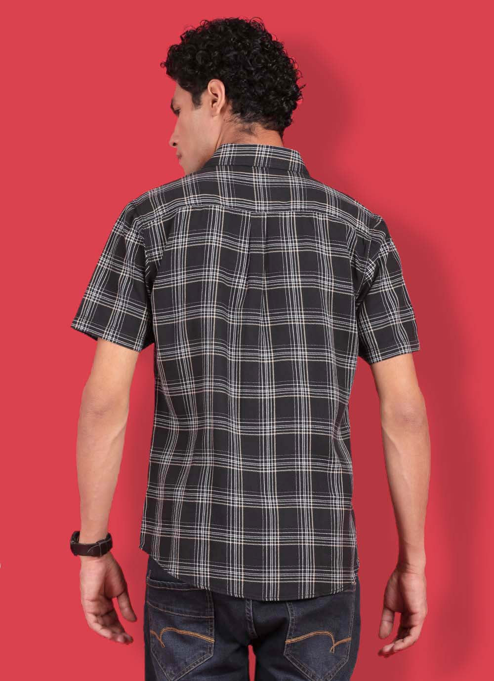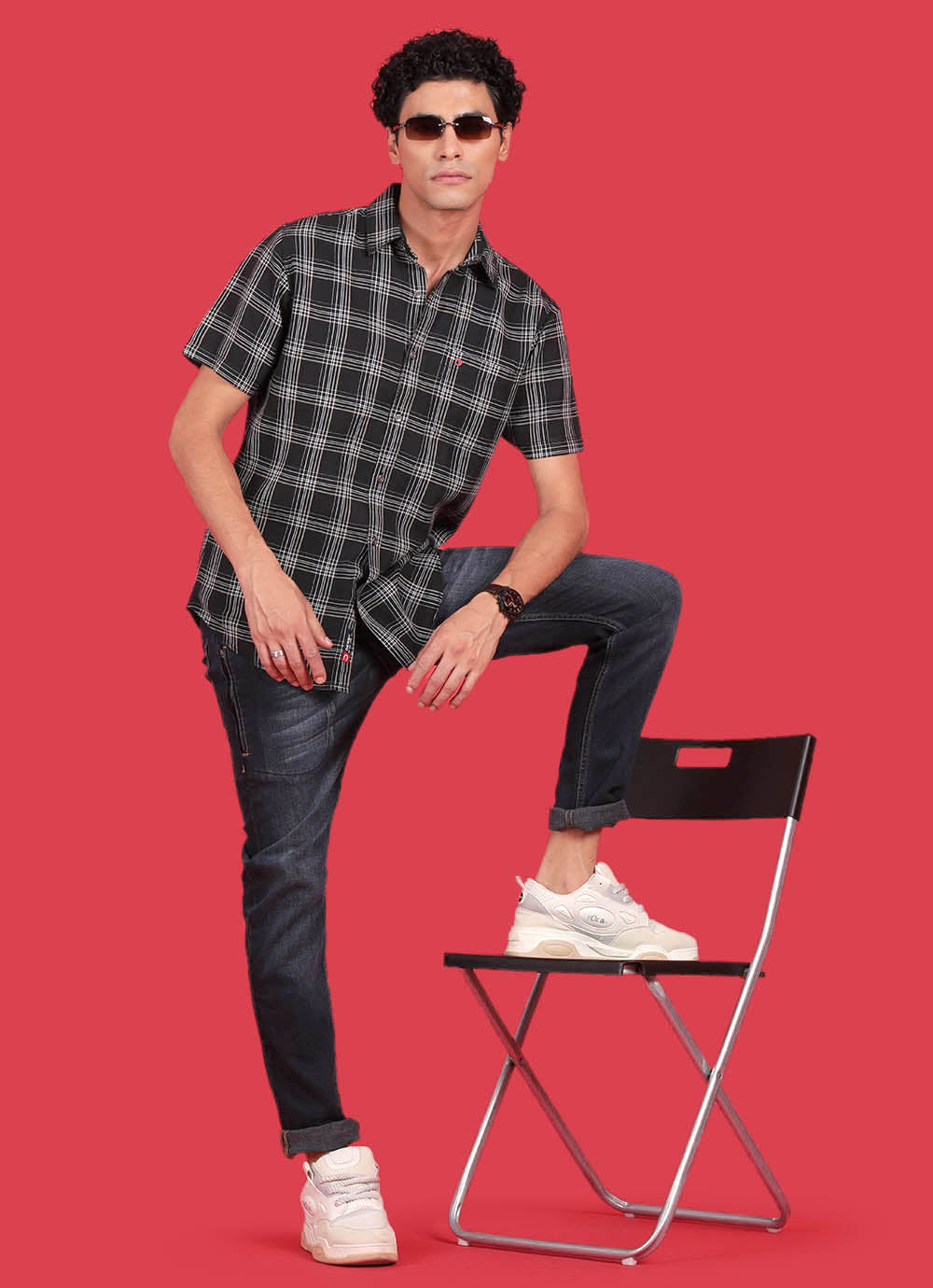 Indulge in fashion mania with our Black Checkered Slim Fit Denim Shirt. Crafted from premium denim, it marries comfort with unparalleled style. The captivating checkered pattern sets the stage for a contemporary fashion frenzy, while a single patch pocket adds an intriguing touch. With short sleeves, this shirt effortlessly embodies a fusion of classic and daring style, ideal for trendsetters who demand cutting-edge fashion. Immerse yourself in the mania with this black masterpiece, an absolute must-have for the style-conscious.