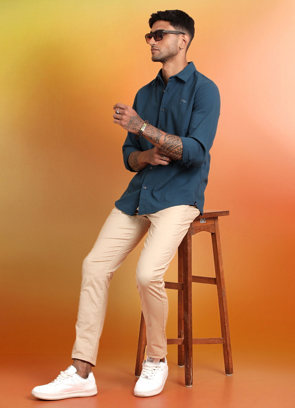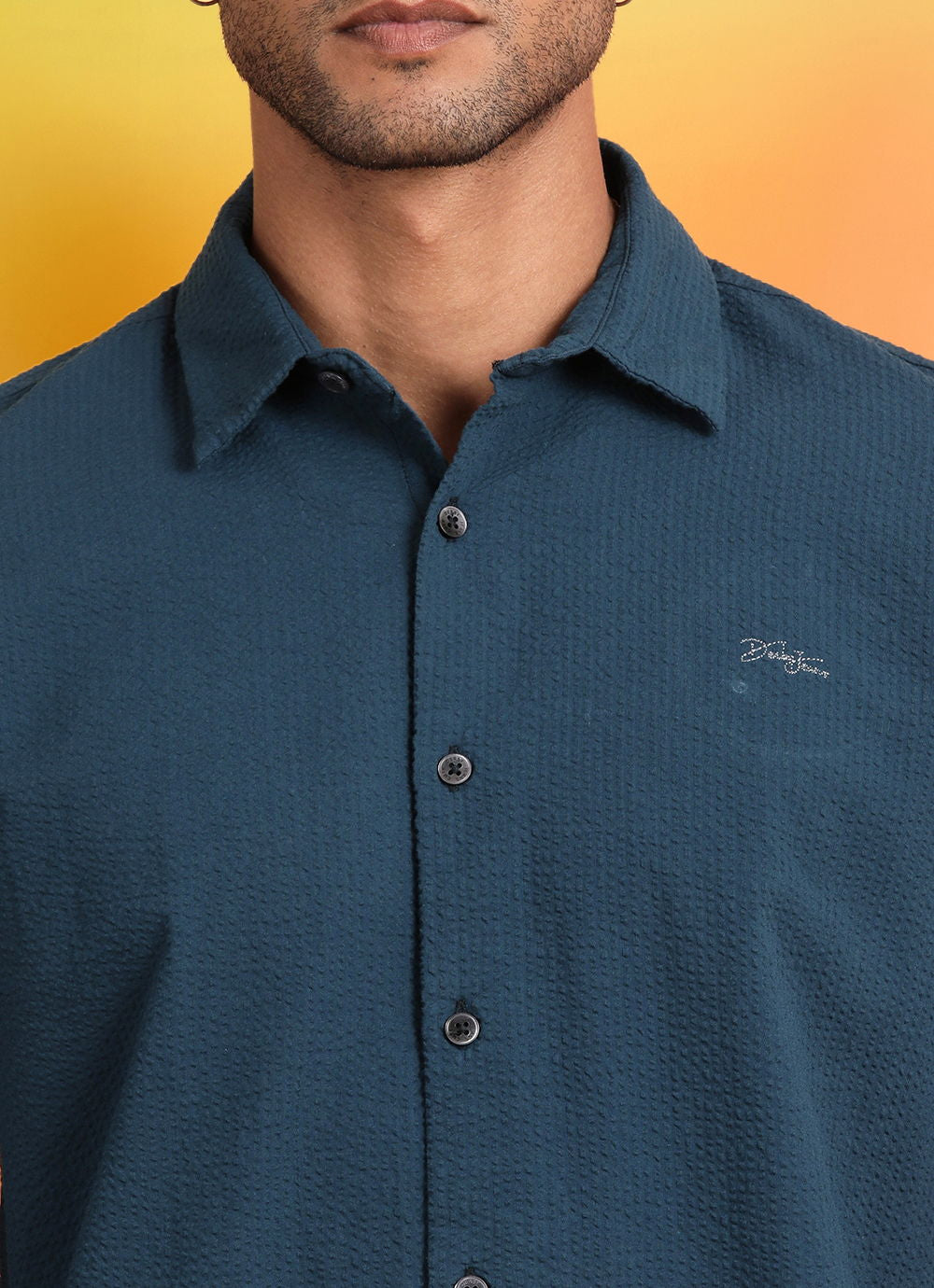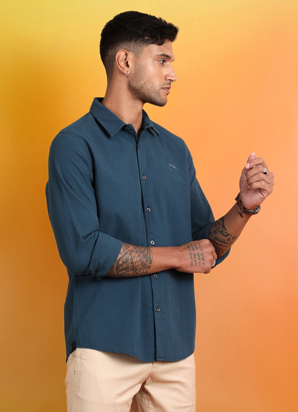 Prepare to be tickled Blue with our zany Blue Seer-sucker Cotton Shirt! This playful shirt defies convention, featuring a slim fit, long sleeves, and one patch pockets perfect for the eccentric fashion maverick. Crafted from high-quality cotton, it's a delightful twist on classic style, making you the life of the style party!