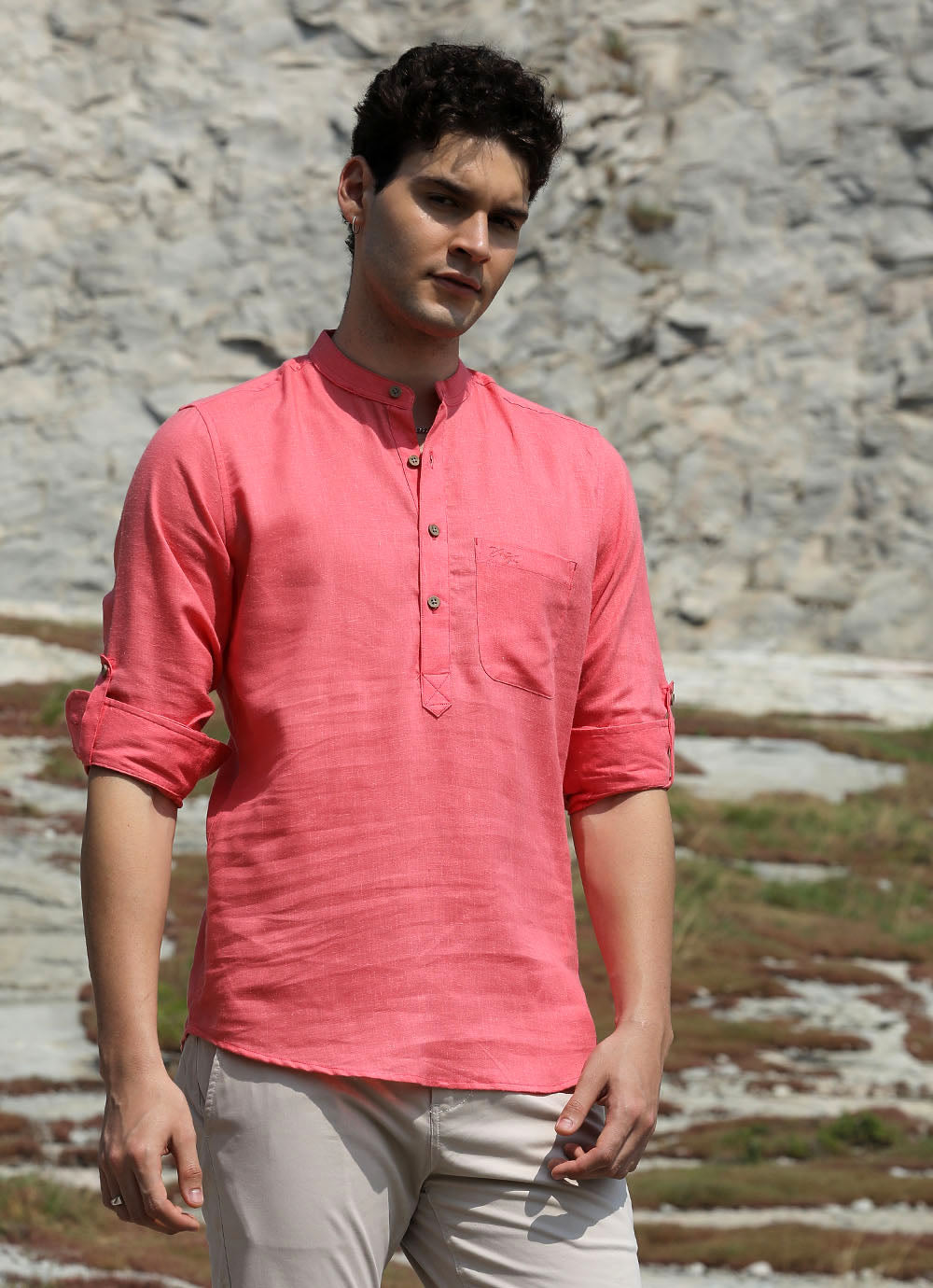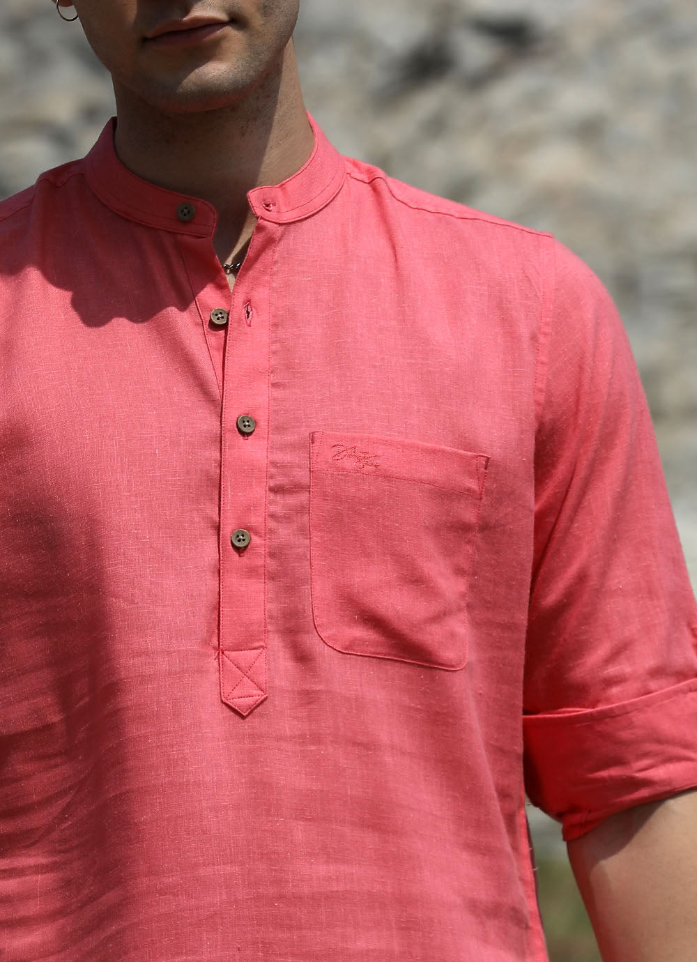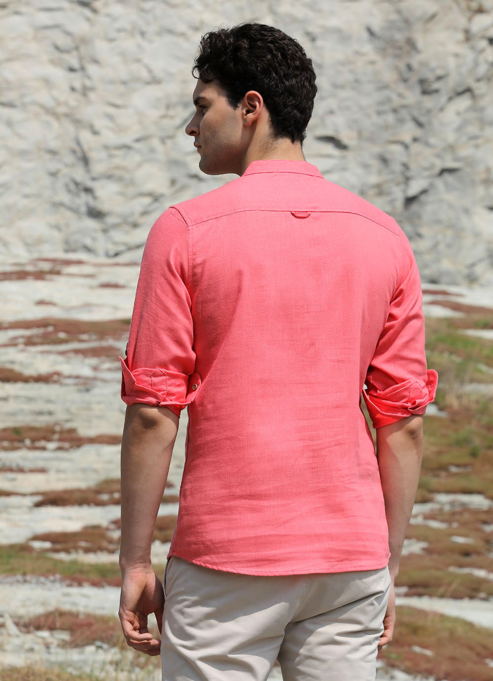 Step up your style game with this Coral Cotton Shirt, featuring a sleek mandarin collar, full sleeves, and a patch pocket. The slim fit design adds a tailored touch for a sharp look. Pair with dark jeans and boots for a bold, edgy vibe that’s perfect for both work and play!