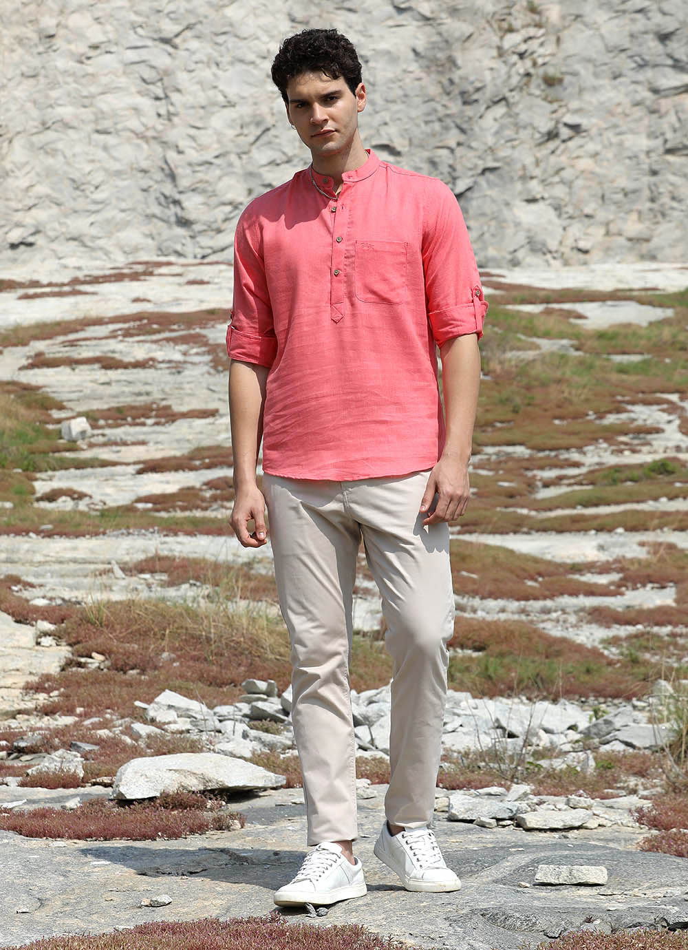 This coral kurta shirt paired with cream trousers creates a vibrant and stylish combination. White shoes complete the look, keeping it fresh and modern. Ideal for summer events or casual outings.