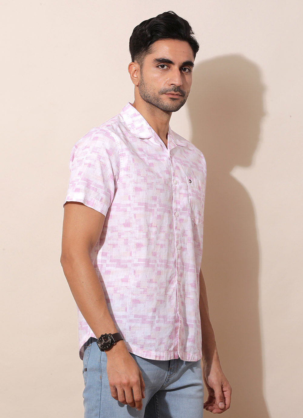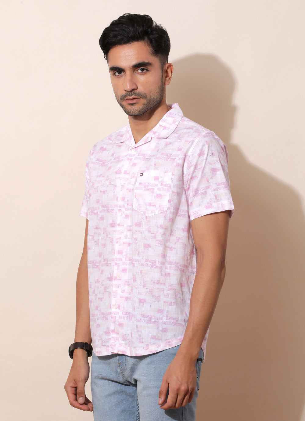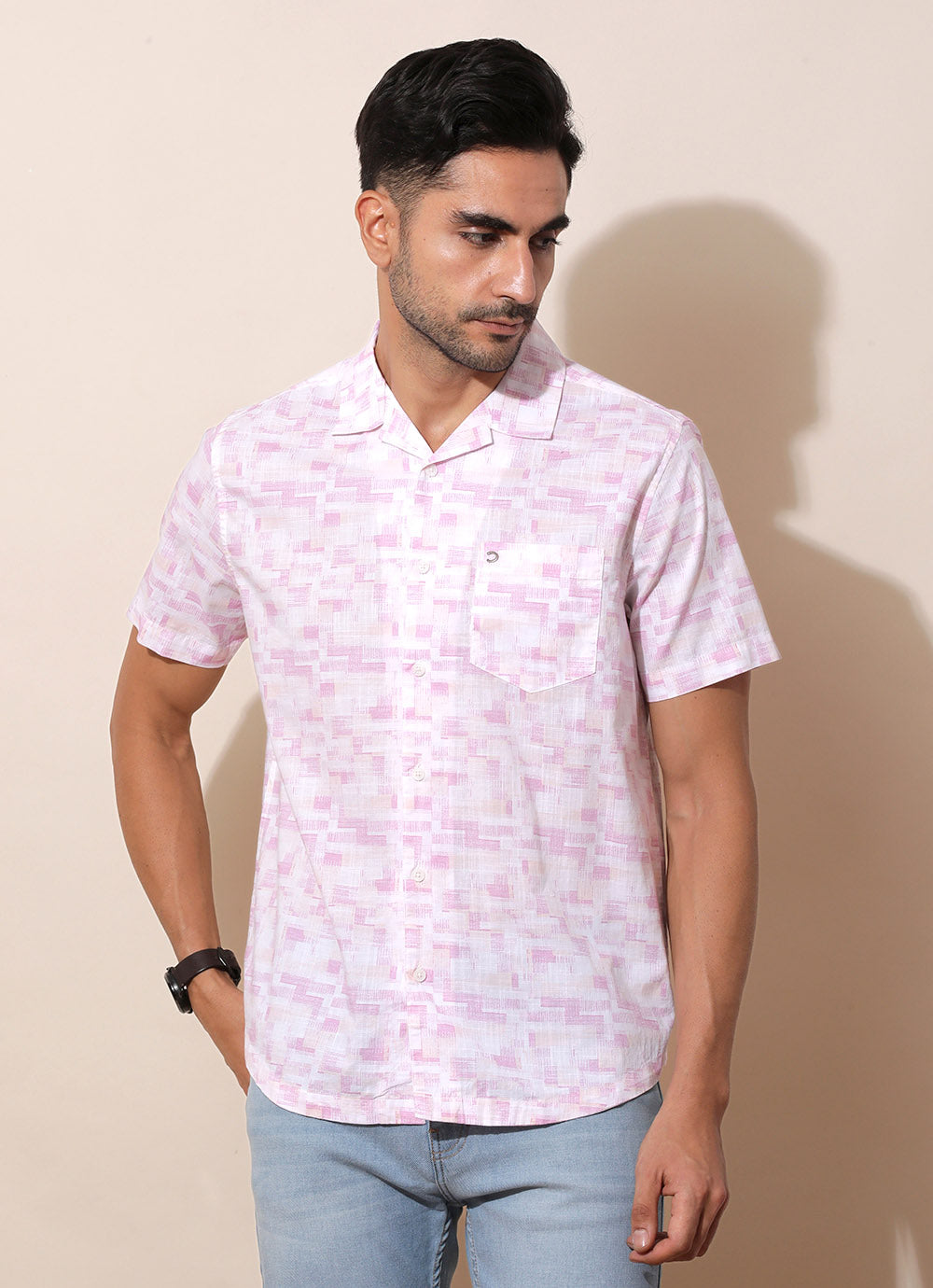 Red Cotton Shirt – a bold statement piece for the modern trendsetter! With half sleeves and a Cuban collar, it exudes retro-inspired charm with a contemporary twist. The patch pocket adds a touch of utility and style. Pair with tailored trousers and leather loafers for a sleek and sophisticated look that commands attention. Elevate your style with this voguish wardrobe essential!