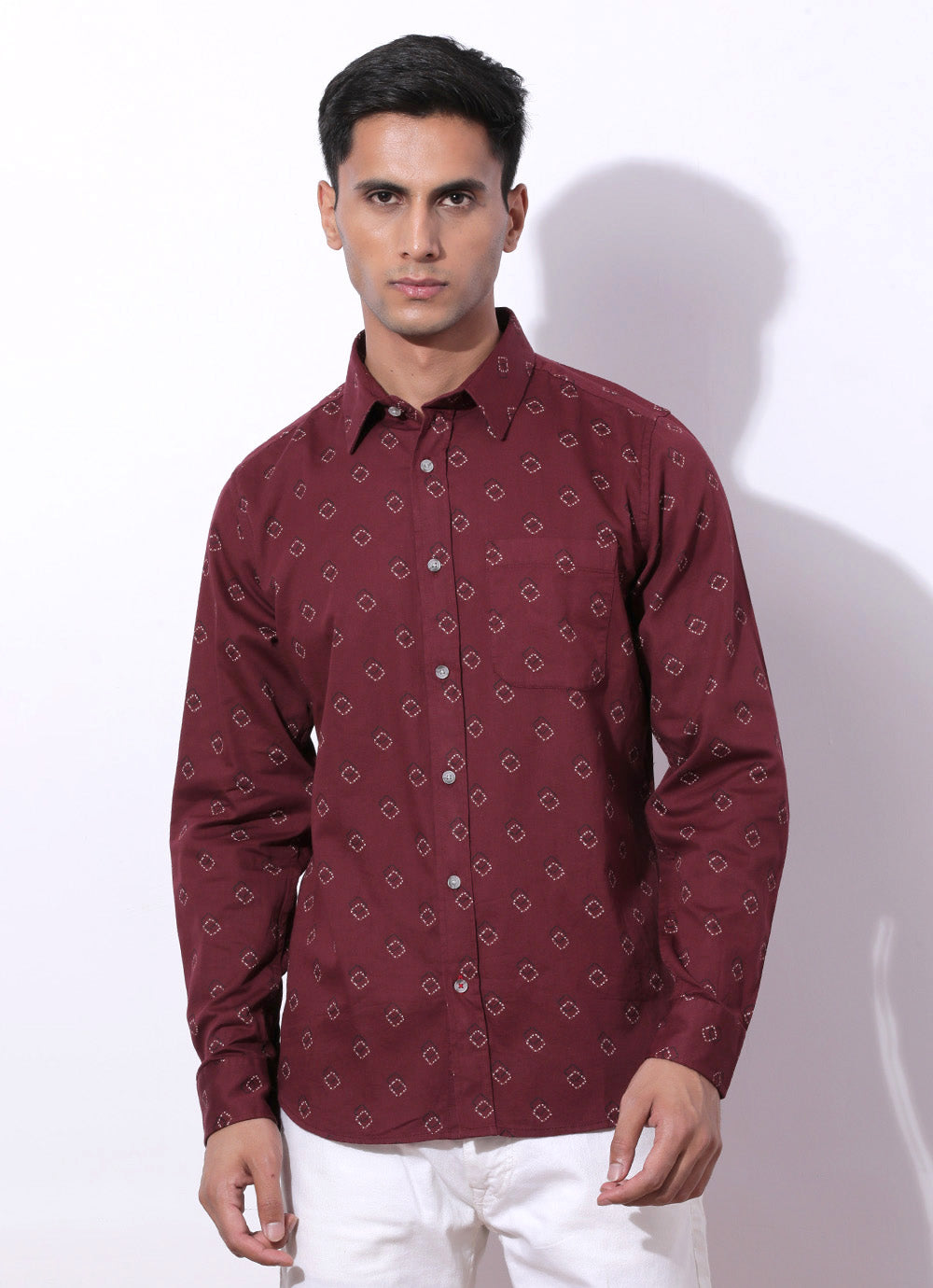 The "Crimson Oasis" shirt: a desert bloom in your wardrobe oasis! Crafted from luxurious cotton, its full sleeves and spread collar exude sophistication. Complete with a charming patch pocket, it's a sartorial mirage. Pair with beige linen trousers for a chic ensemble that radiates warmth and elegance.