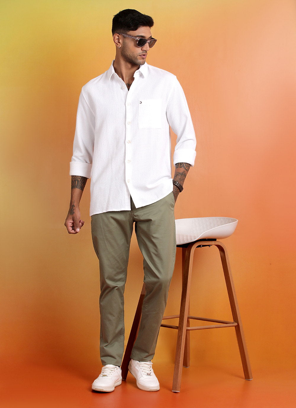 The White waffle shirt with Green jeans creates a bold, confident contrast. White sneakers adds casual comfort, and rolled-up sleeves give it a relaxed vibe. Sunglasses complete the cool, laid-back look.