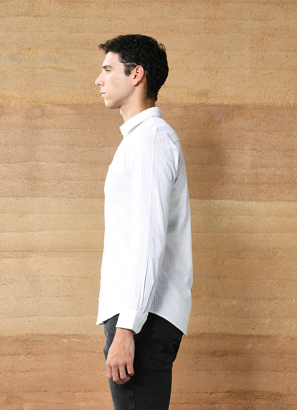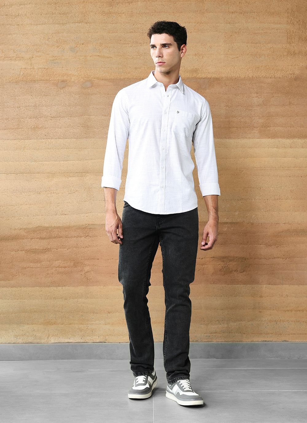 This Grey Stripes Cotton Slim Fit Shirt is a timeless piece designed with subtle vertical stripes that add sophistication to your everyday style. Crafted from breathable cotton, it offers all-day comfort with a sharp, tailored silhouette. The slim fit cut enhances your frame, making it suitable for both office wear and casual outings.