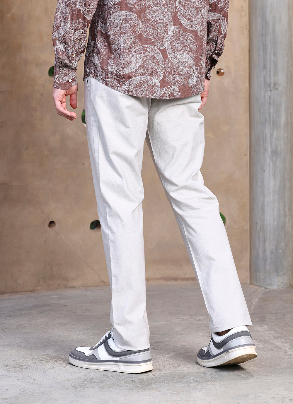 Crafted from premium cotton slub fabric, these trousers offer a refined texture that sets them apart from everyday basics. The natural slub weave lends a touch of character and breathability, while the slim fit silhouette ensures a sharp, tailored look. Lightweight yet structured, they are designed to balance comfort with sophistication.