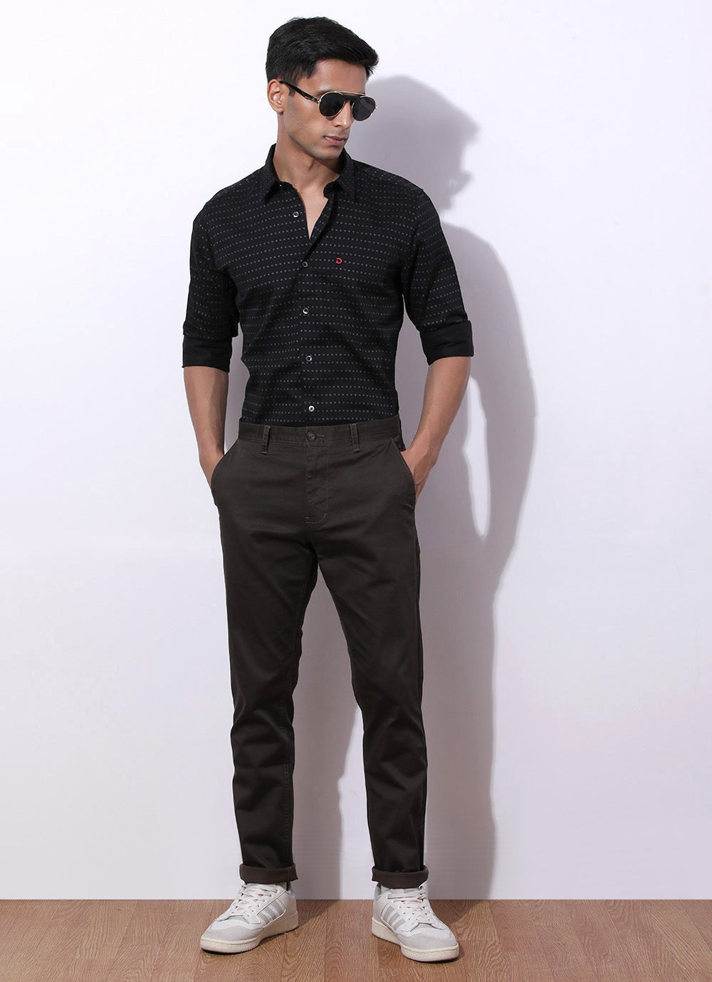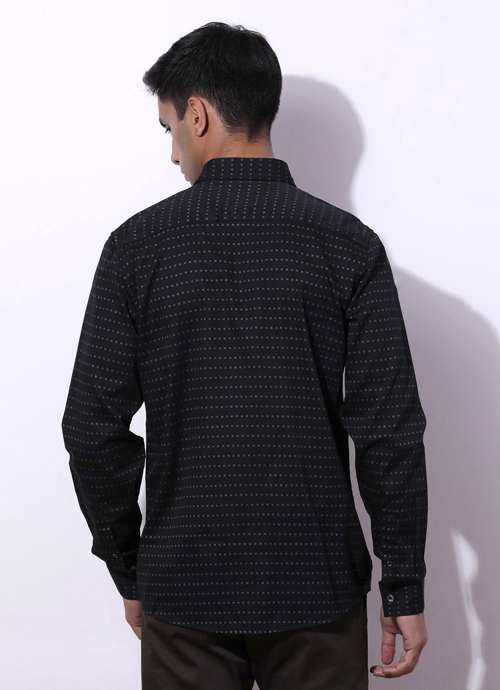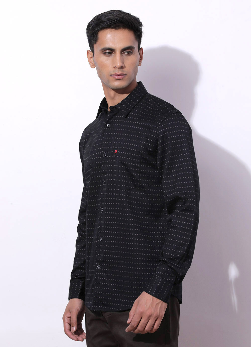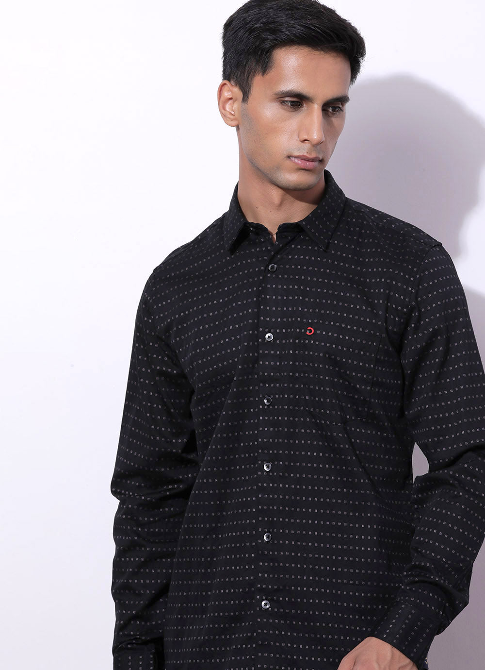 Introducing the "Shadow Slayer" shirt: a midnight marvel that eclipses all others! Crafted from luxurious cotton, its inky black hue exudes mystique. With full sleeves and a sleek spread collar, it's a silhouette of sophistication. Pair with tailored grey trousers and a statement belt for a look that commands attention in any setting!