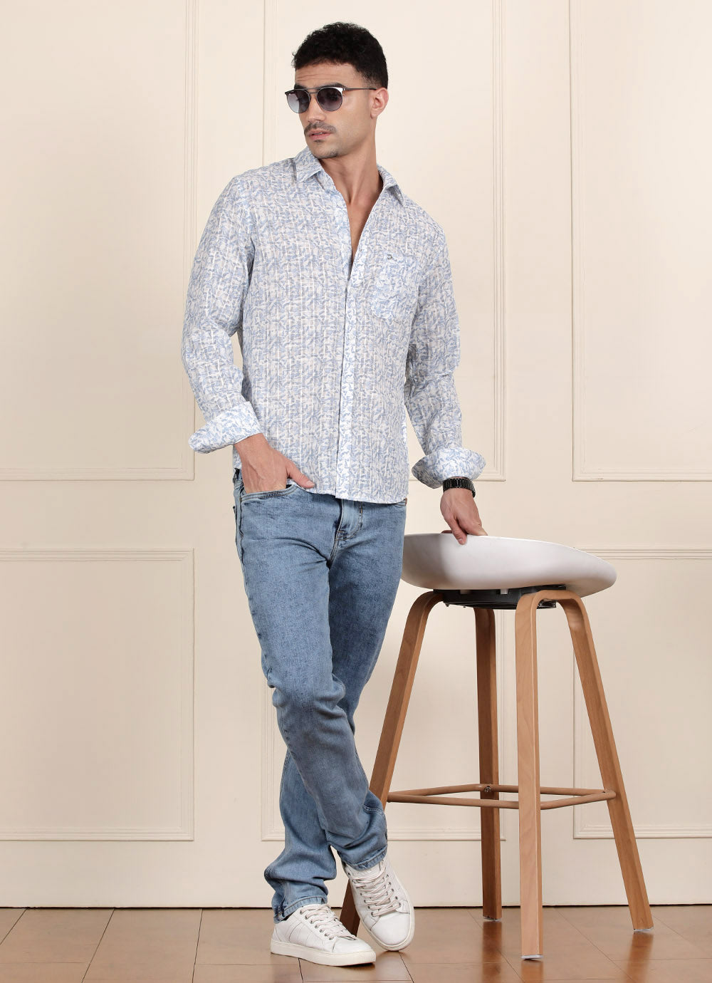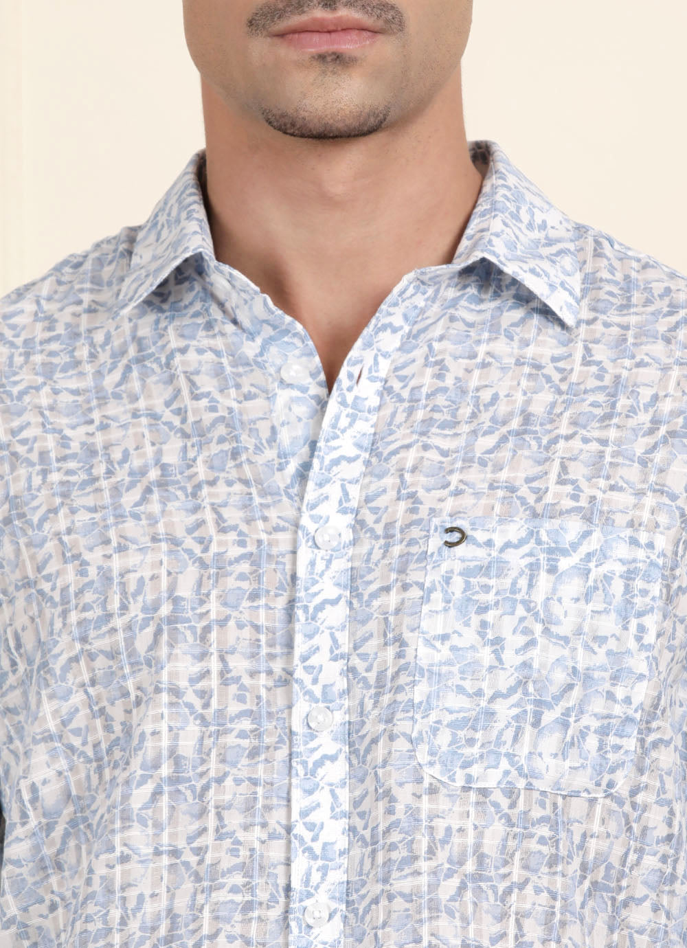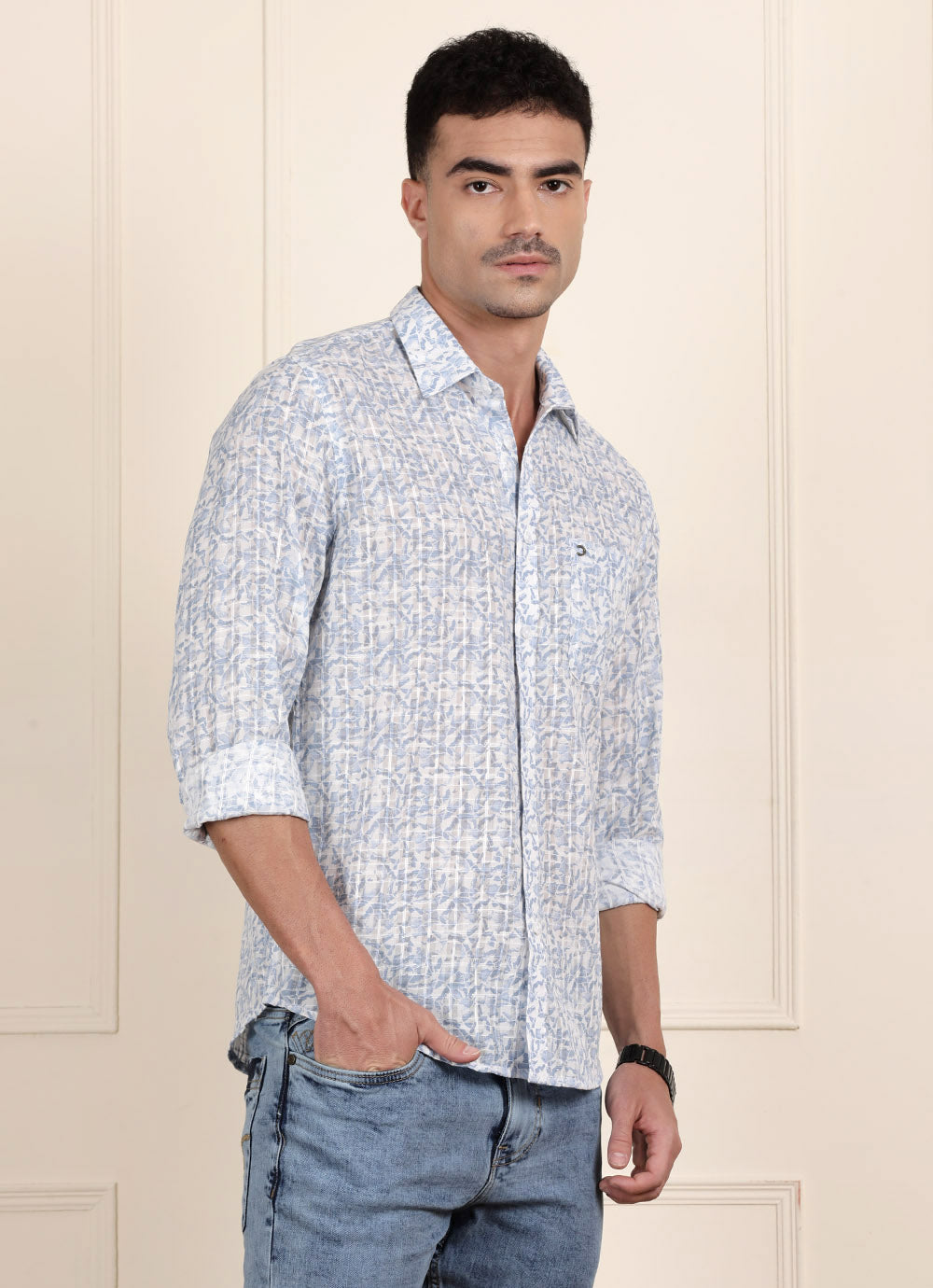 Textured blue for a modern edge—this printed slim-fit shirt keeps things fresh and fitted. Works with joggers or layered under a jacket.