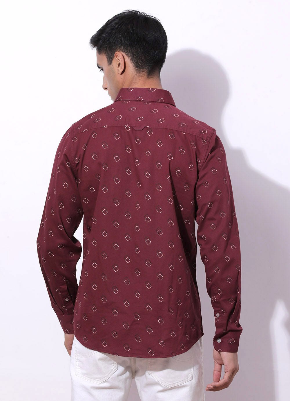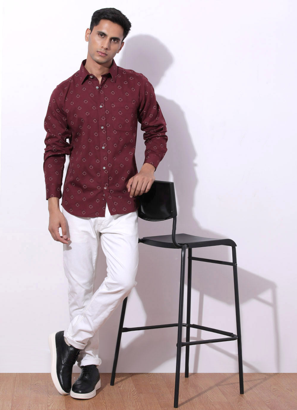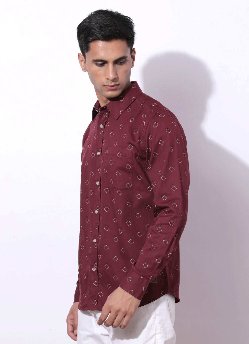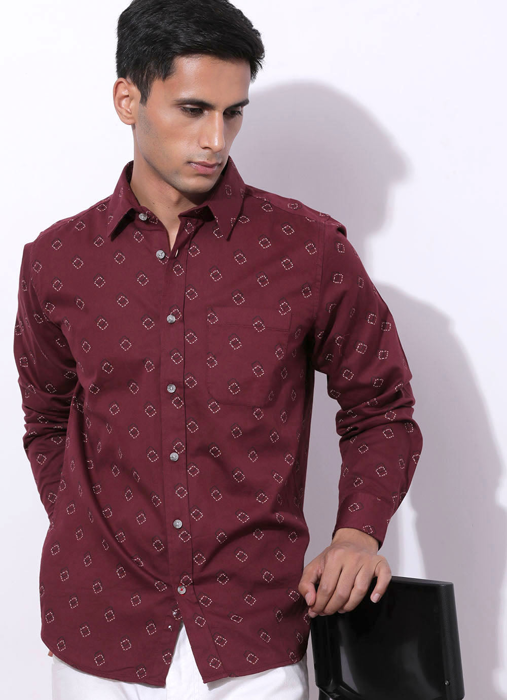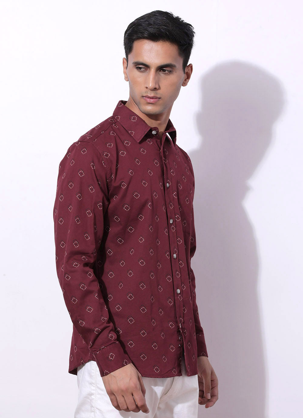 The "Crimson Oasis" shirt: a desert bloom in your wardrobe oasis! Crafted from luxurious cotton, its full sleeves and spread collar exude sophistication. Complete with a charming patch pocket, it's a sartorial mirage. Pair with beige linen trousers for a chic ensemble that radiates warmth and elegance.