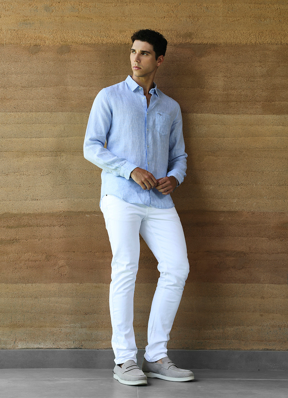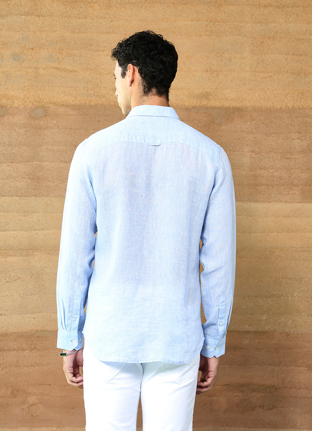 Tailored from premium linen fabric, this slim-fit shirt offers a breathable and lightweight feel, making it perfect for all-day comfort. The solid blue tone enhances its timeless appeal, while the sharp slim silhouette ensures a modern, refined look.