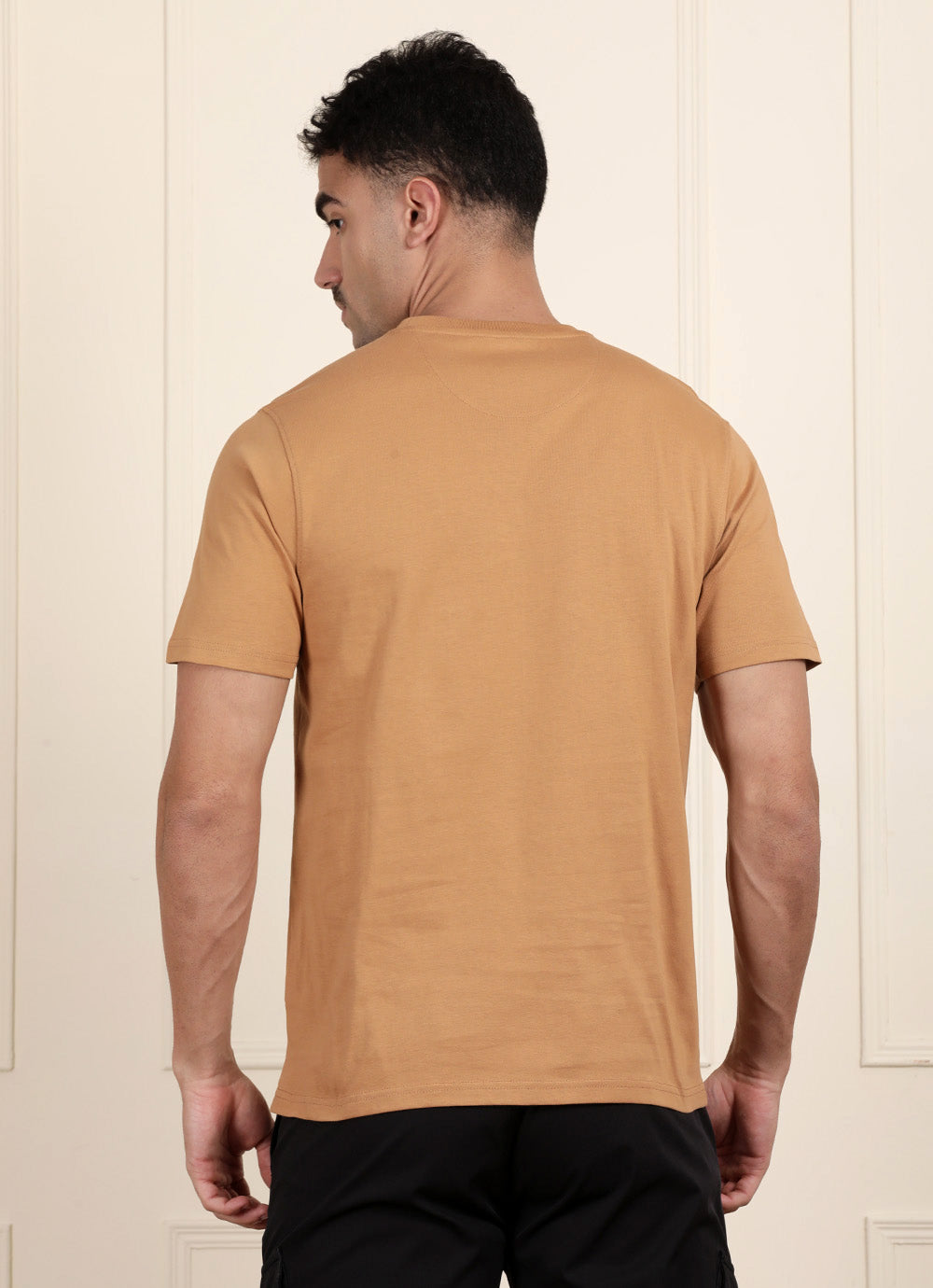 Earthy and effortless—this round-neck slim-fit tee brings comfort in a khaki hue. Style it with navy shorts or chinos for a grounded, clean look.