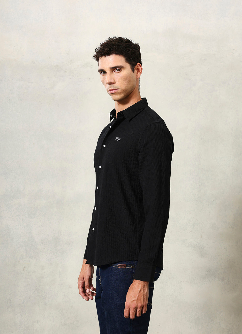 Keep it timeless with this Black Solids Cotton Slim Fit Shirt. Designed in breathable cotton with a textured finish, this shirt delivers understated sophistication in a sleek black hue. The slim fit cut ensures a sharp, modern profile, while the button-down front and minimal embroidered branding add a refined touch. A versatile staple that transitions effortlessly from workdays to evening outings.