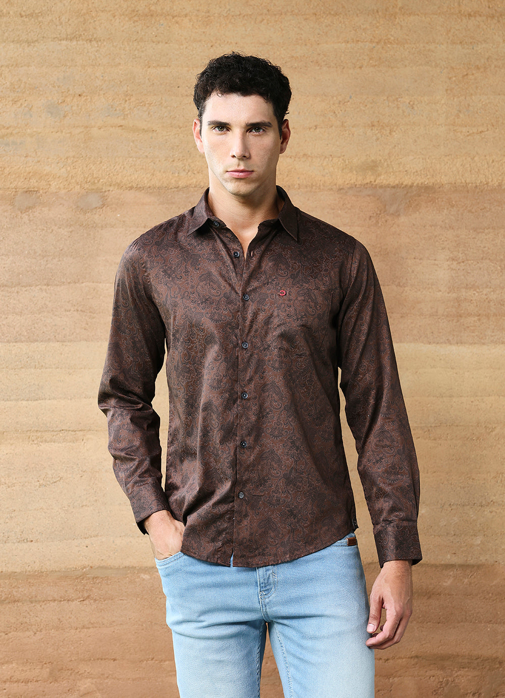 Bring a touch of bold sophistication to your wardrobe with this Brown Print Cotton Satin Slim Fit Shirt. Tailored from smooth cotton satin, it features a rich all-over paisley-inspired print in earthy brown tones, enhanced by the subtle sheen of satin. The slim fit cut ensures a sharp silhouette, making it ideal for occasions where style meets elegance.