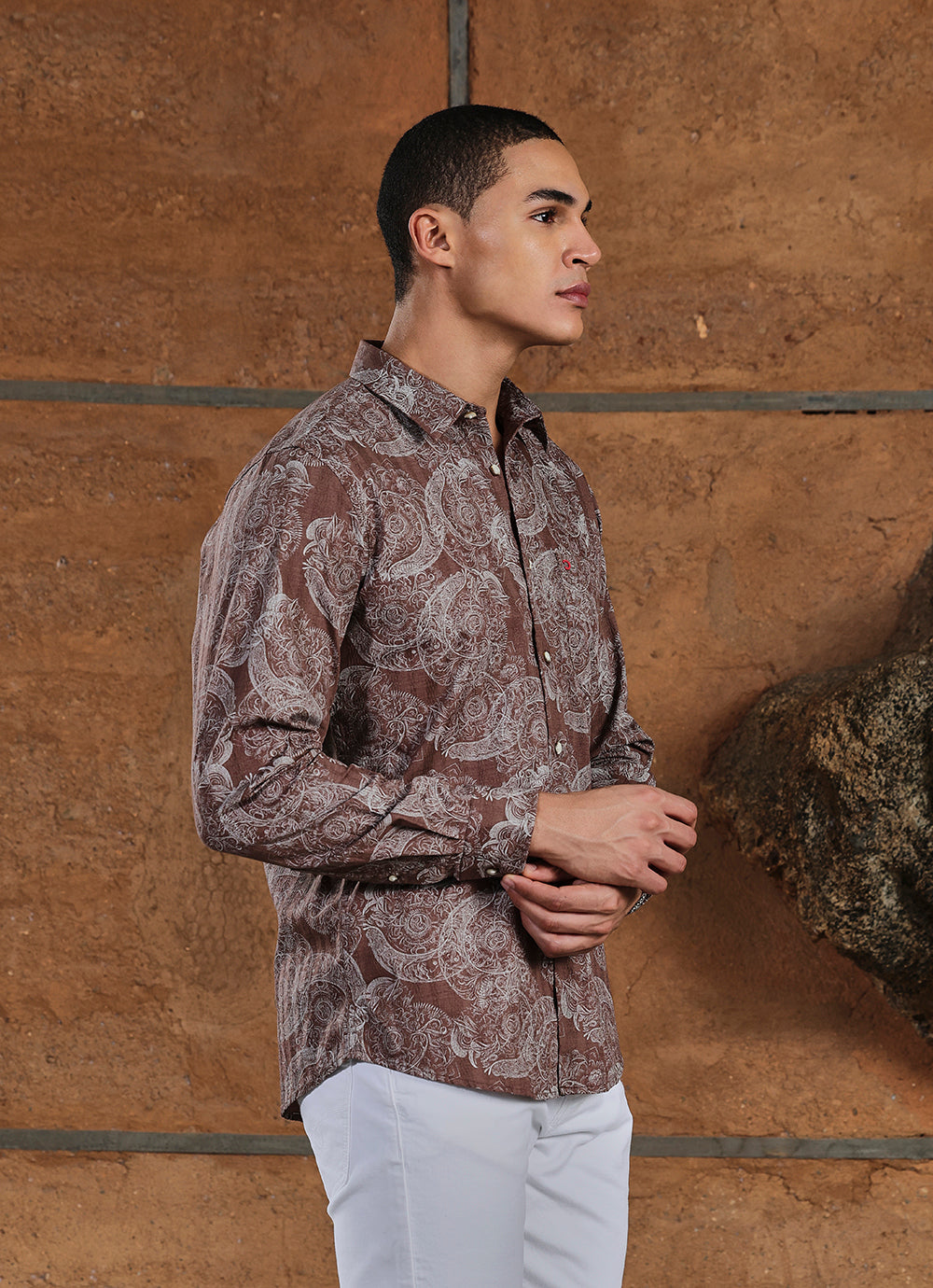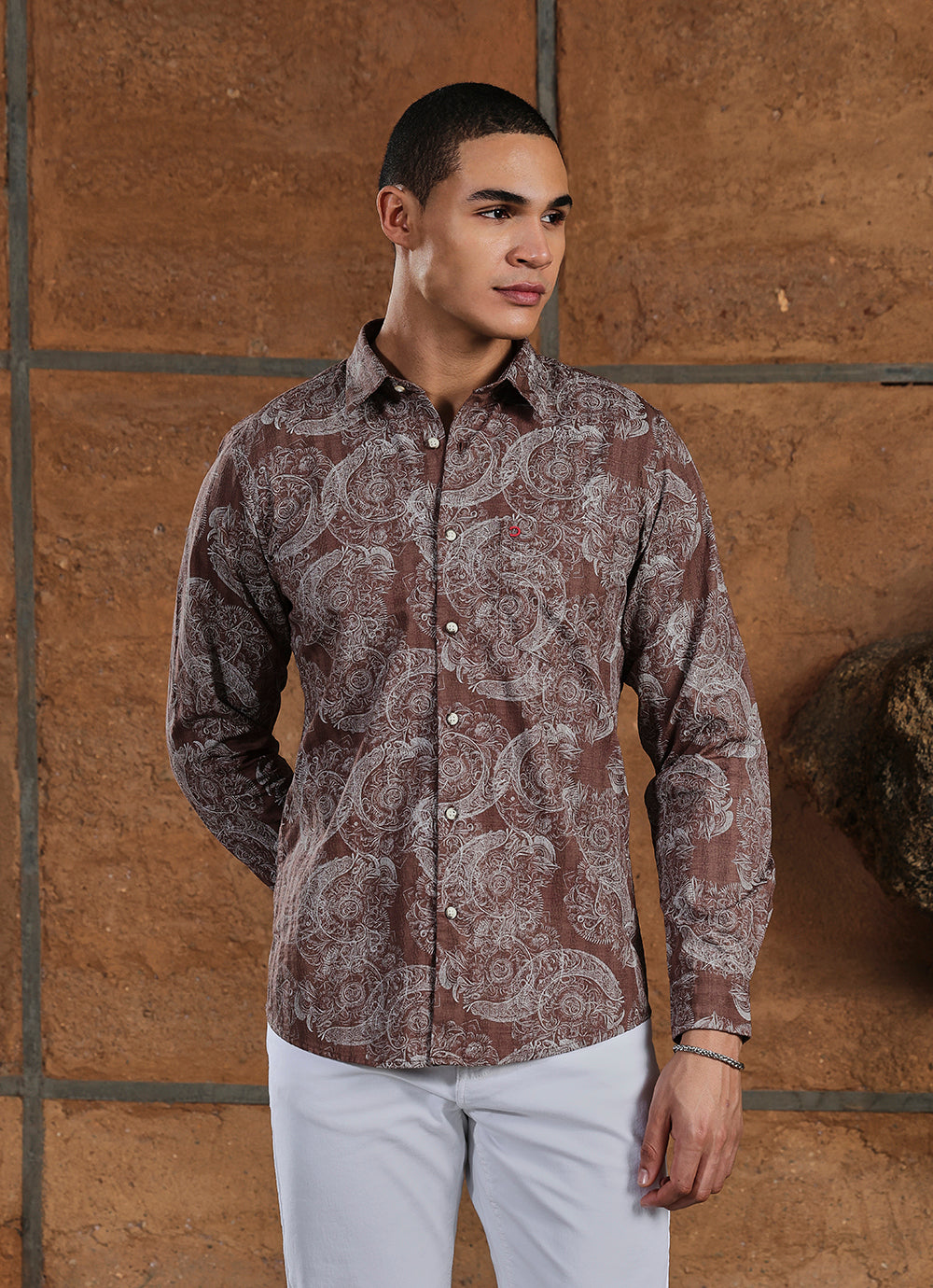 Make a confident impression with this Brown Print Cotton Slim Fit Shirt, featuring an intricate all-over pattern that balances boldness with sophistication. The earthy brown tone is complemented by detailed white motifs, creating a shirt that’s versatile enough for both day and evening wear. Designed in a flattering slim fit, it offers sharp tailoring with modern ease.