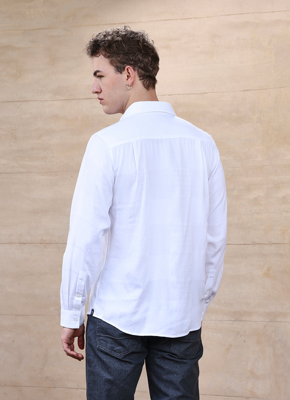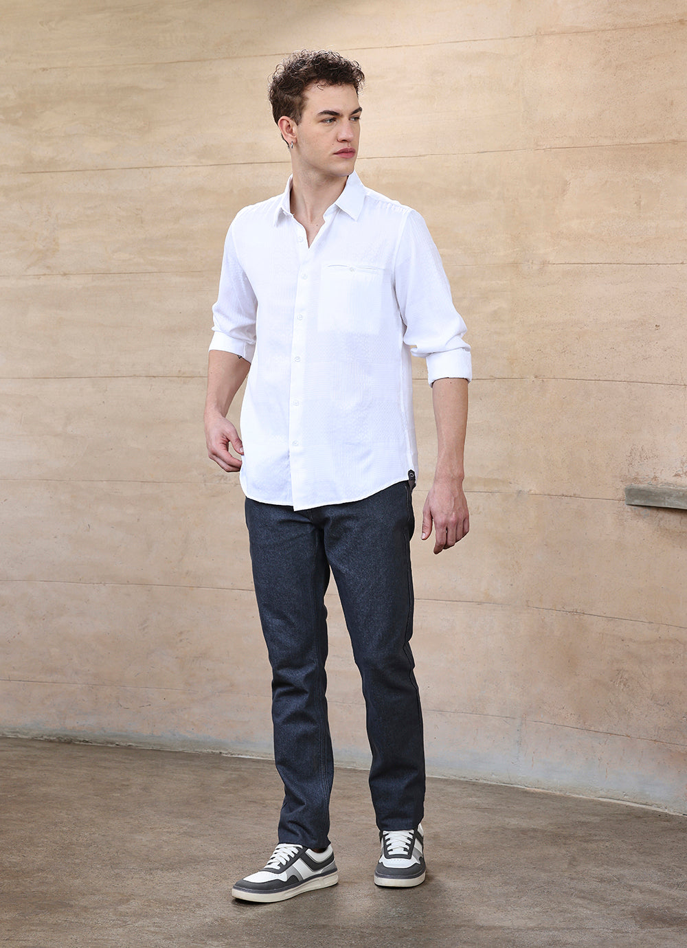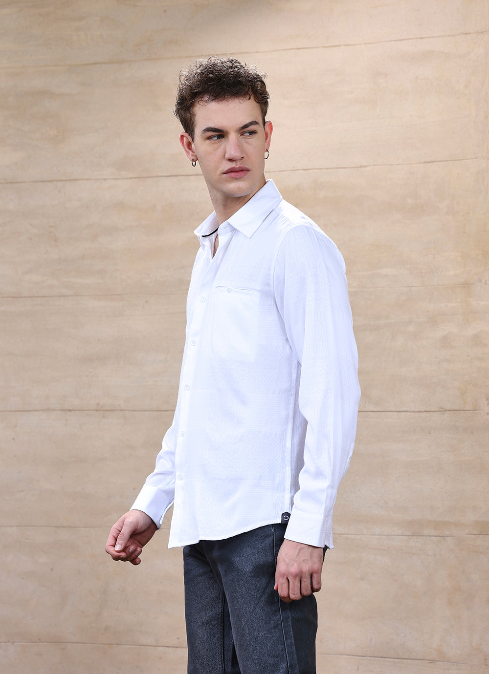 A masterpiece in refined tailoring, this white slim-fit shirt is crafted from premium cotton jacquard, showcasing an artisanal weave that adds both texture and sophistication. The bespoke finish elevates its timeless appeal, while the breathable fabric ensures all-day comfort. Designed to embody understated luxury, it transitions effortlessly from formal occasions to elevated casual wear.