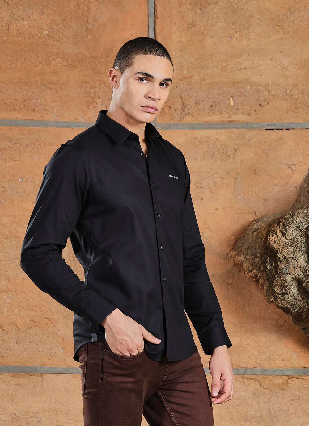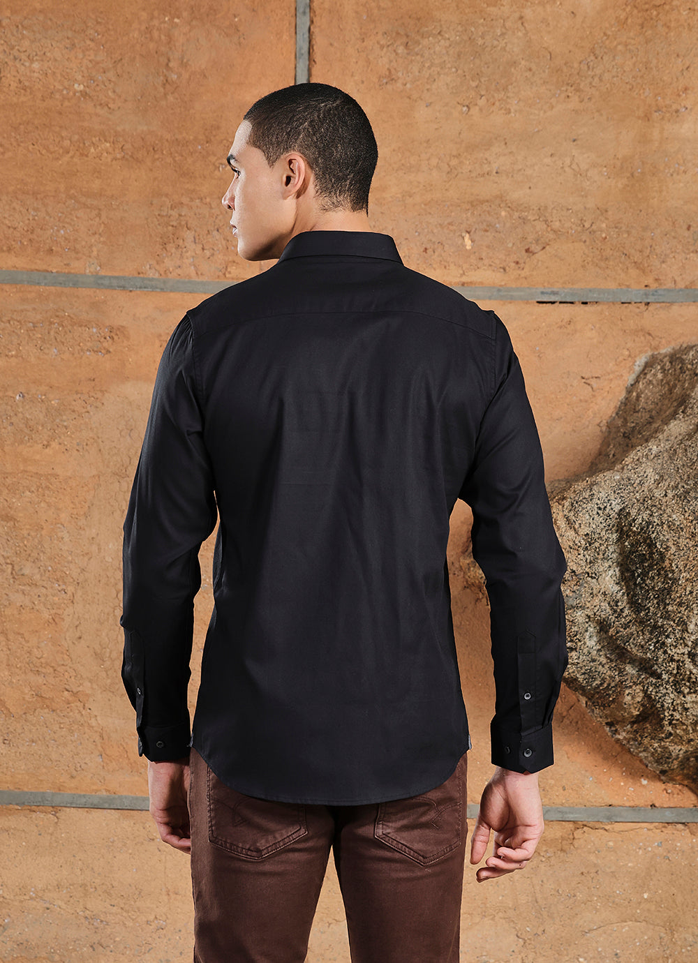 Sharp, sleek, and effortlessly refined — this Black Solids Crepe Satin Slim Fit Shirt is a must-have for evening wear and formal occasions. Crafted from luxurious crepe satin, it offers a subtle sheen with a smooth, premium touch. The slim fit cut ensures a tailored silhouette, perfect for making a bold yet elegant statement.