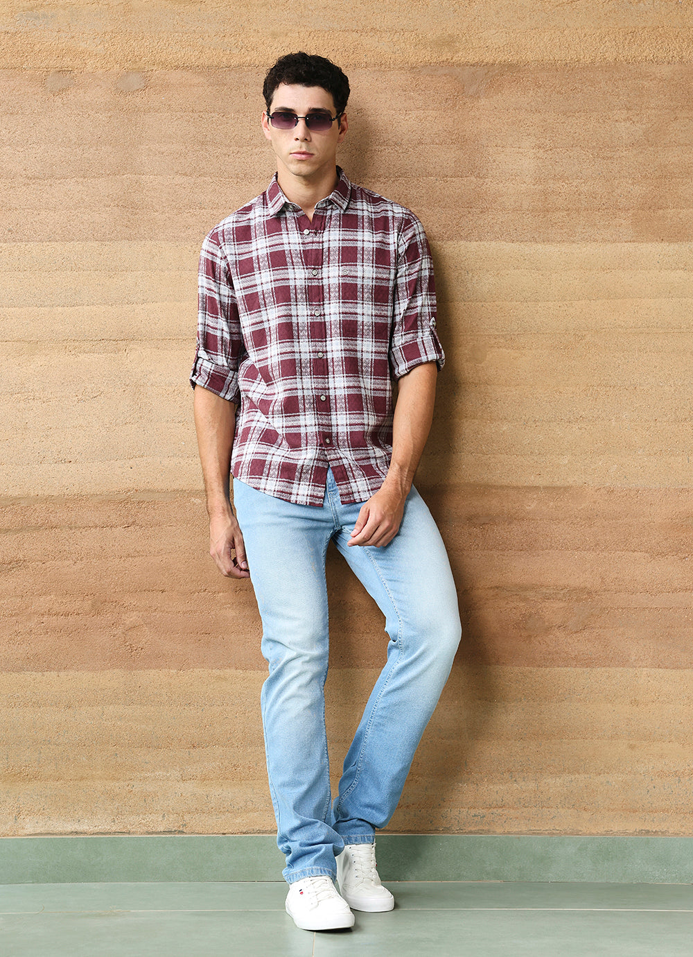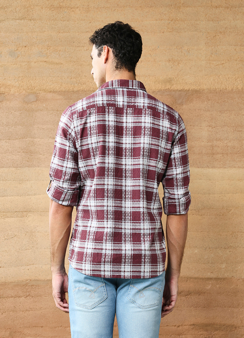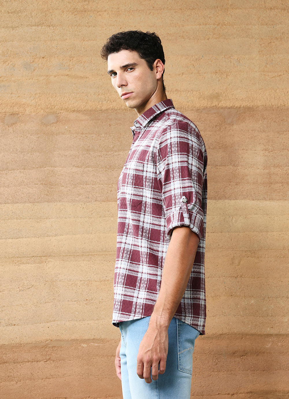 This Dark Brown Checks Cotton Slim Fit Shirt blends timeless checks with a modern tailored fit. Made from premium cotton, it offers all-day comfort and breathability. The buttoned roll-up sleeves and crisp collar make it versatile for both casual and semi-formal occasions.