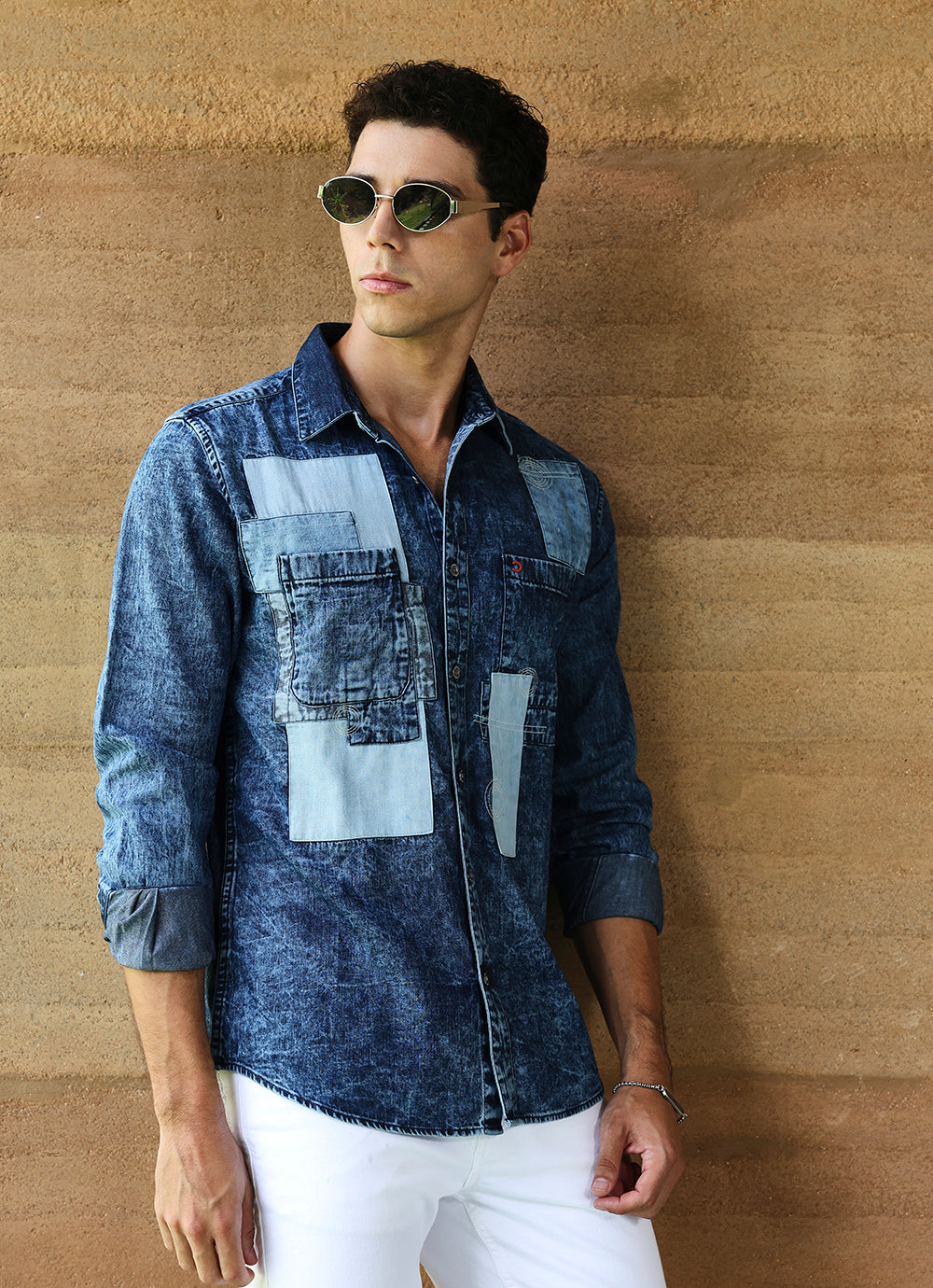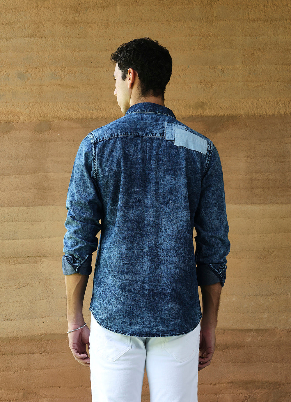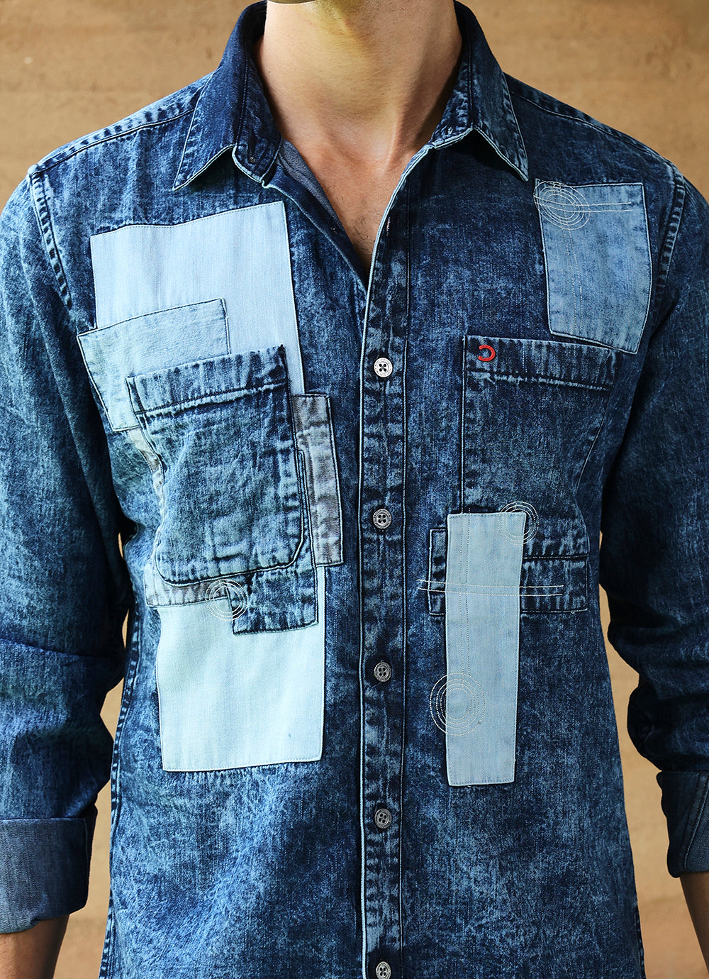 This Navy Solids Indigo Slim Fit Shirt is crafted from premium indigo-dyed cotton denim, featuring a unique patchwork detail in contrasting lighter shades for a bold, rugged look. Designed in a slim fit, it blends modern streetwear with classic denim heritage, making it versatile for both casual and smart-casual outfits.