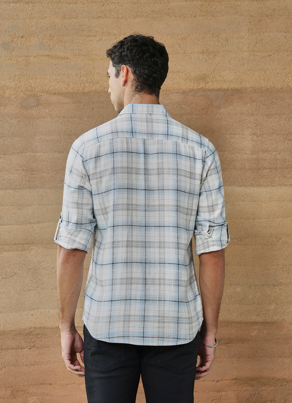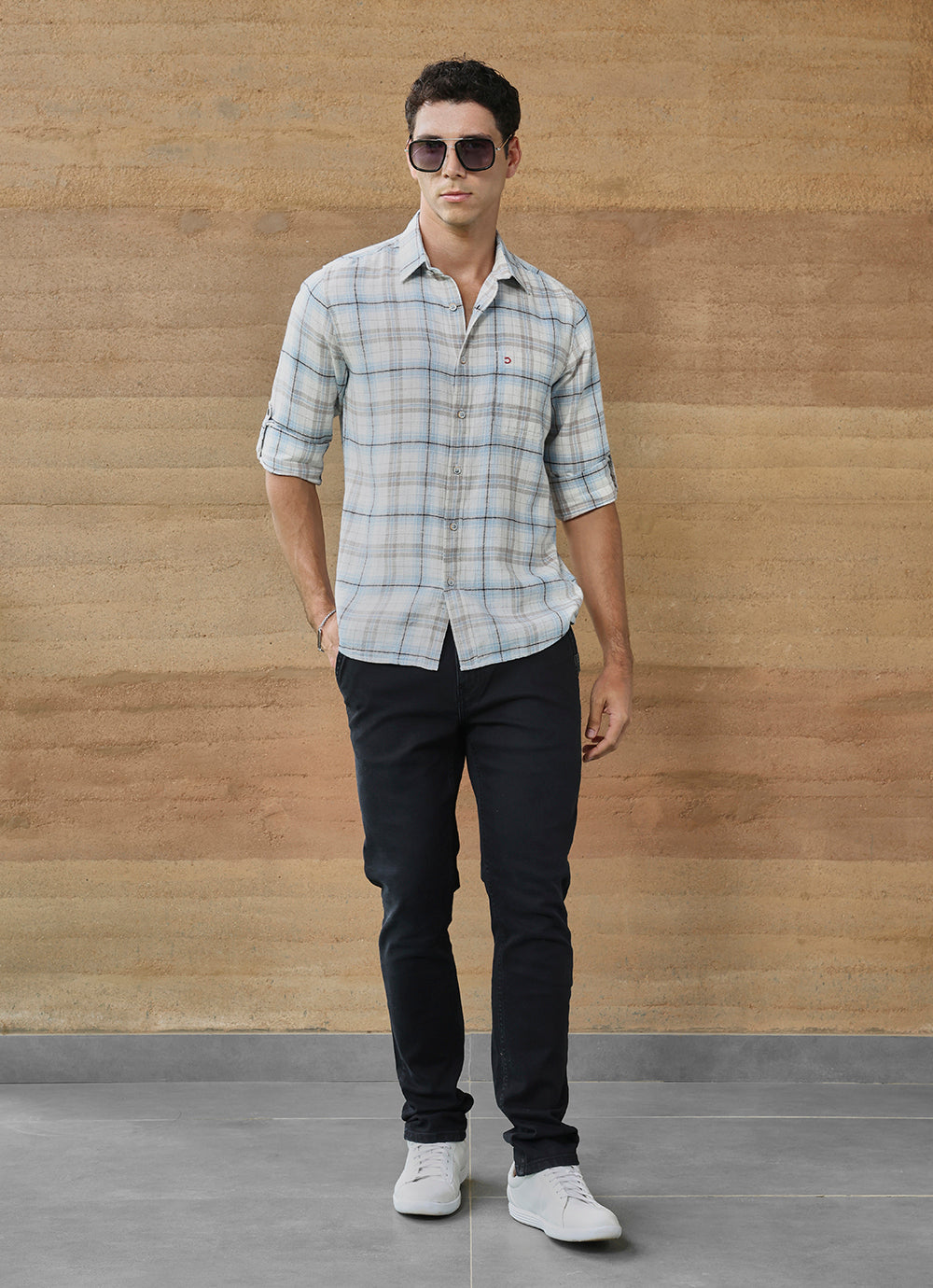 The Offwhite Checks Cotton Slim Fit Shirt features a subtle checkered design in soft offwhite tones with light blue highlights, creating a balanced casual yet refined look. Crafted from breathable cotton fabric, this shirt ensures all-day comfort while the slim fit tailoring provides a sharp and modern silhouette.
