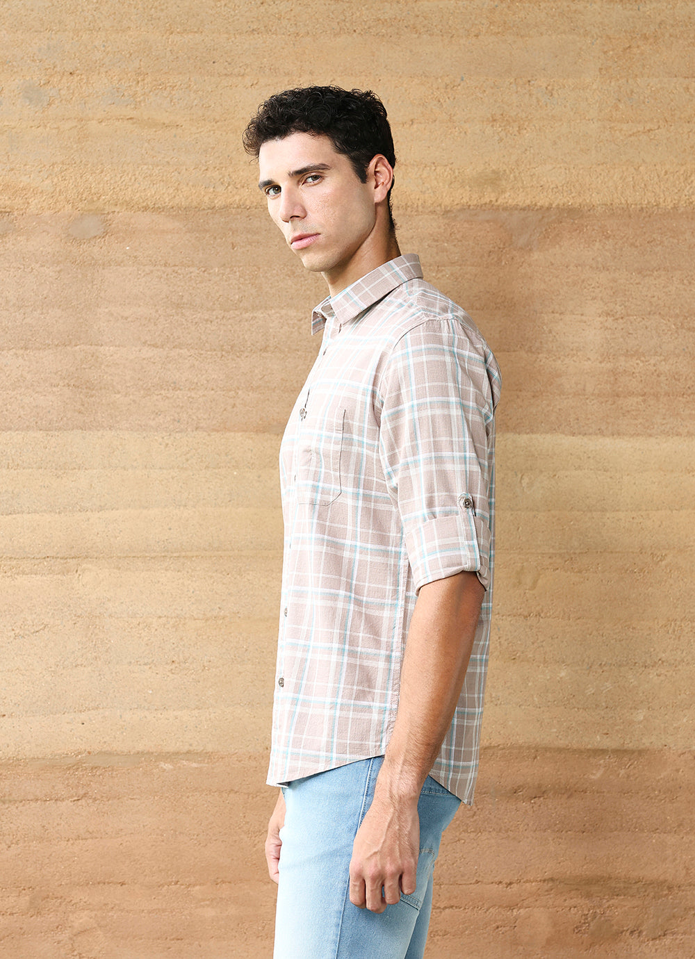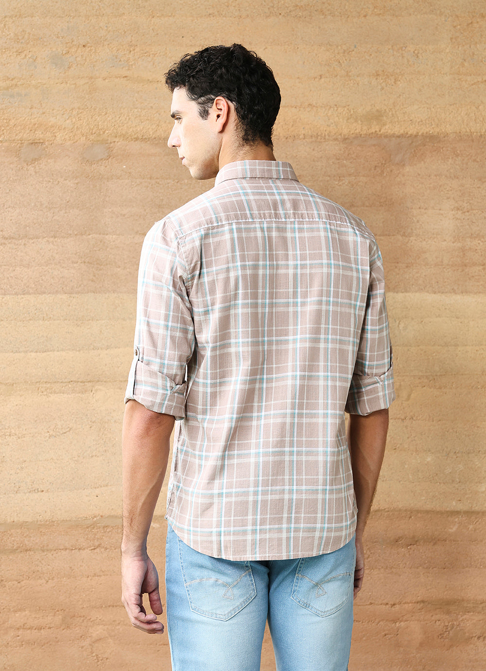 Crafted from soft, breathable cotton, this shirt features a muted brown base with pastel blue and white checks, offering a refined take on everyday checks. The slim fit cut ensures a sharp silhouette, while the fabric’s natural comfort makes it perfect for all-day wear.