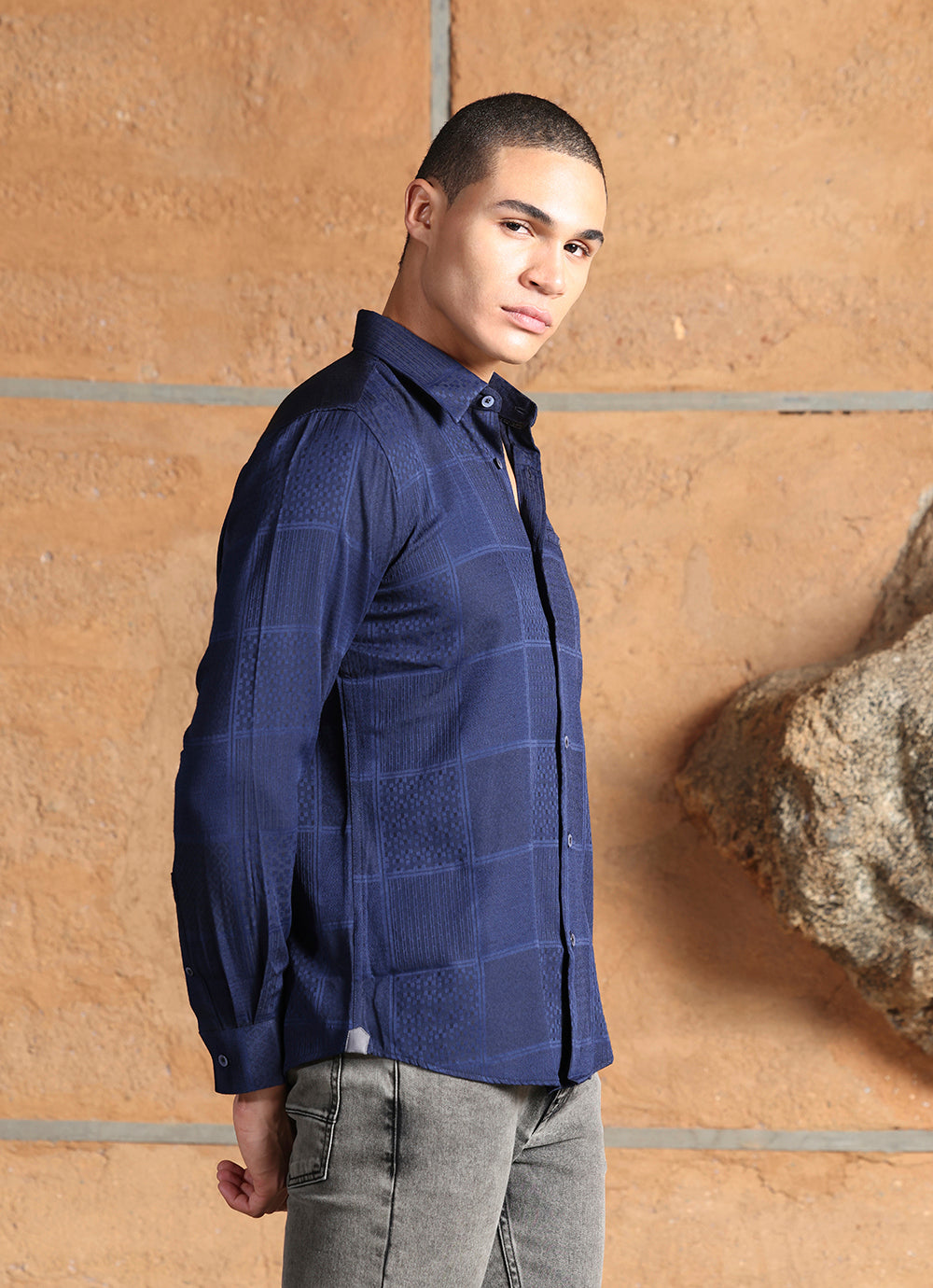 Navy Print Cotton Jacquard Slim Fit Shirt