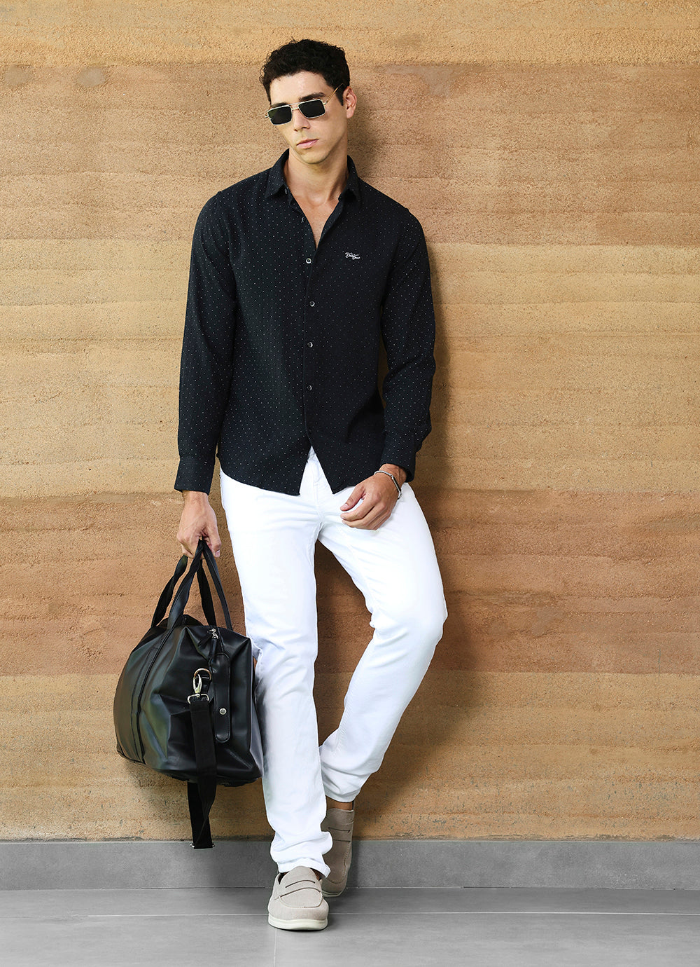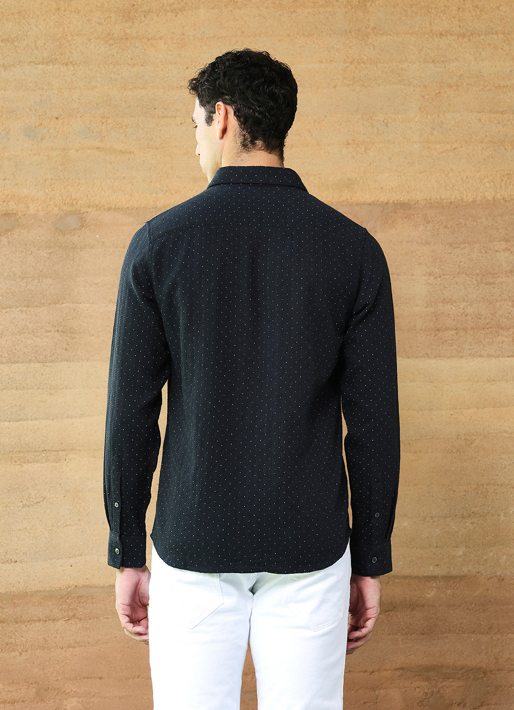 Tailored from premium cotton fabric, this shirt offers a breathable yet refined texture that ensures all-day comfort. The micro-print detailing adds depth to the deep black base, giving it a sophisticated yet modern appeal. Designed in a slim fit cut, it shapes cleanly to the body, making it ideal for both casual evenings and sharp semi-formal looks.