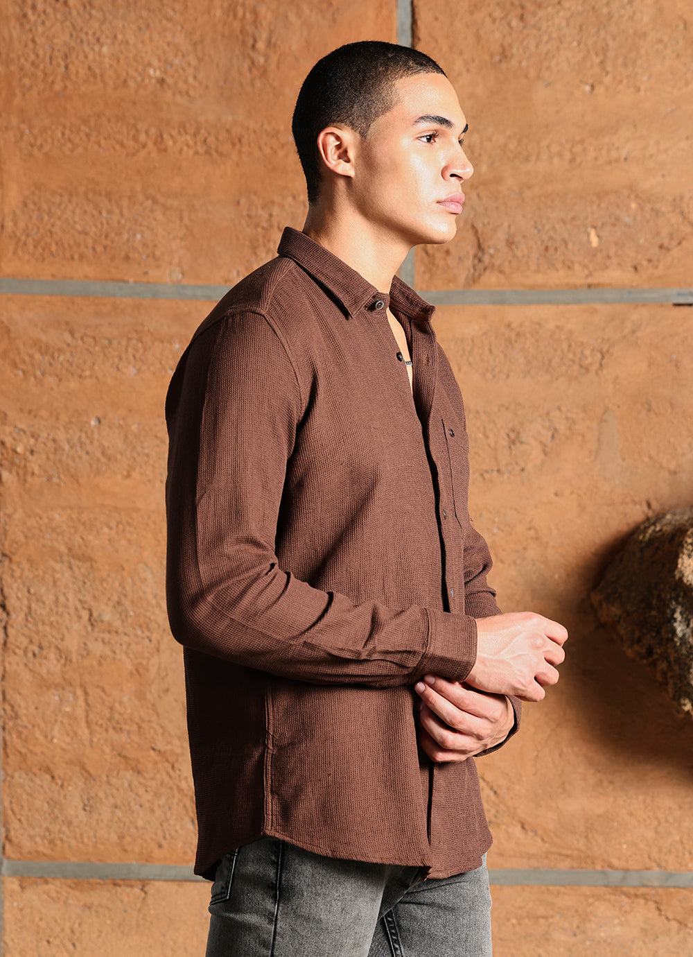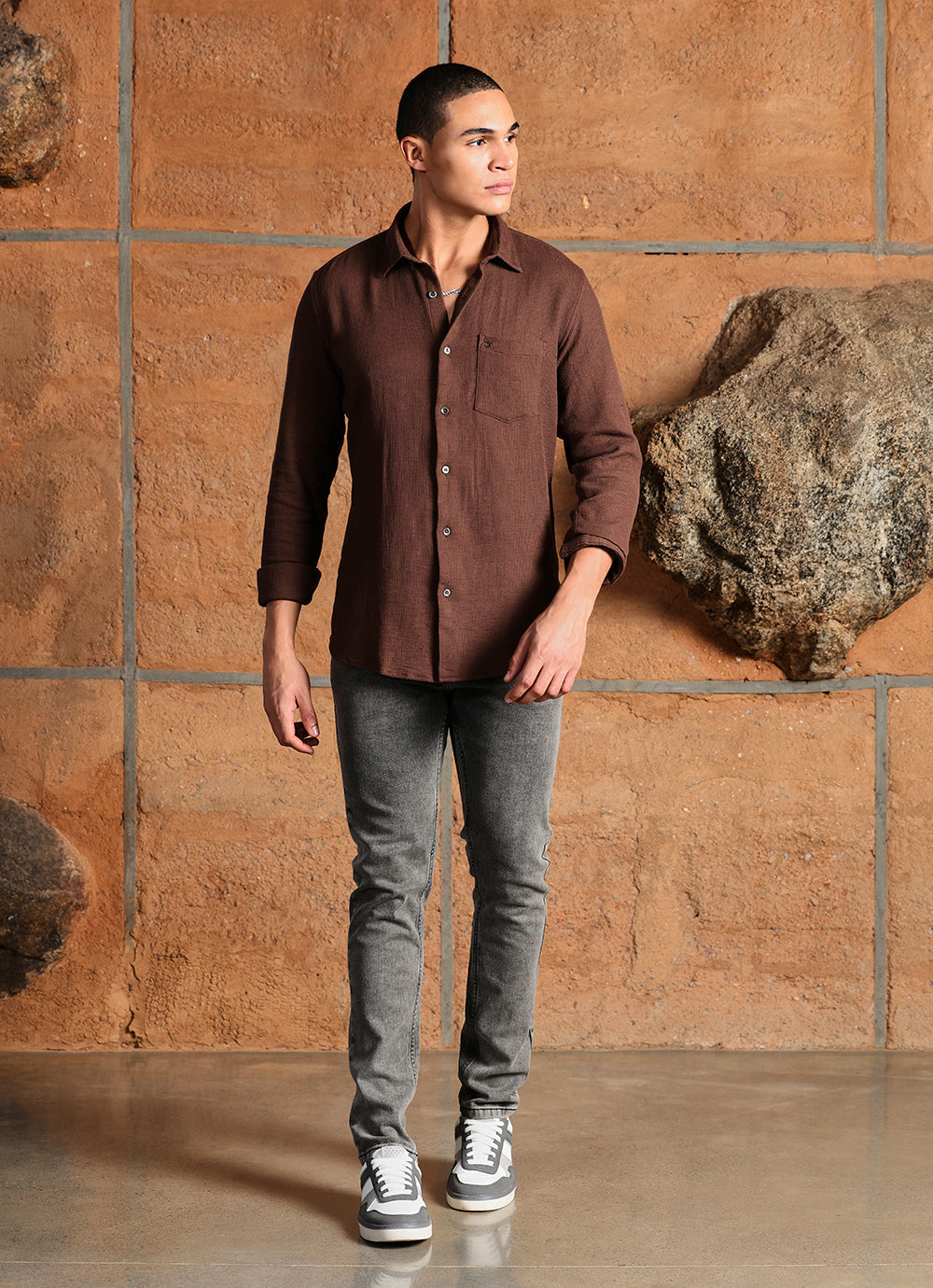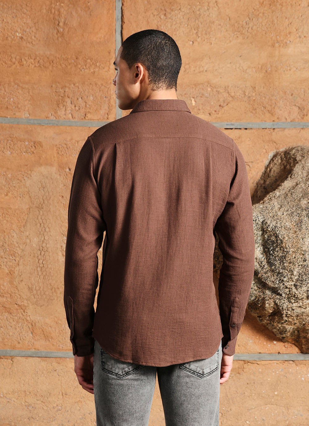 Effortlessly versatile, this Brown Solids Cotton Slim Fit Shirt is tailored for those who appreciate timeless style with modern comfort. Made from breathable cotton, it ensures all-day ease while maintaining a smart silhouette. The earthy brown hue adds warmth and depth, making it an ideal choice for casual meet-ups or semi-formal outings.