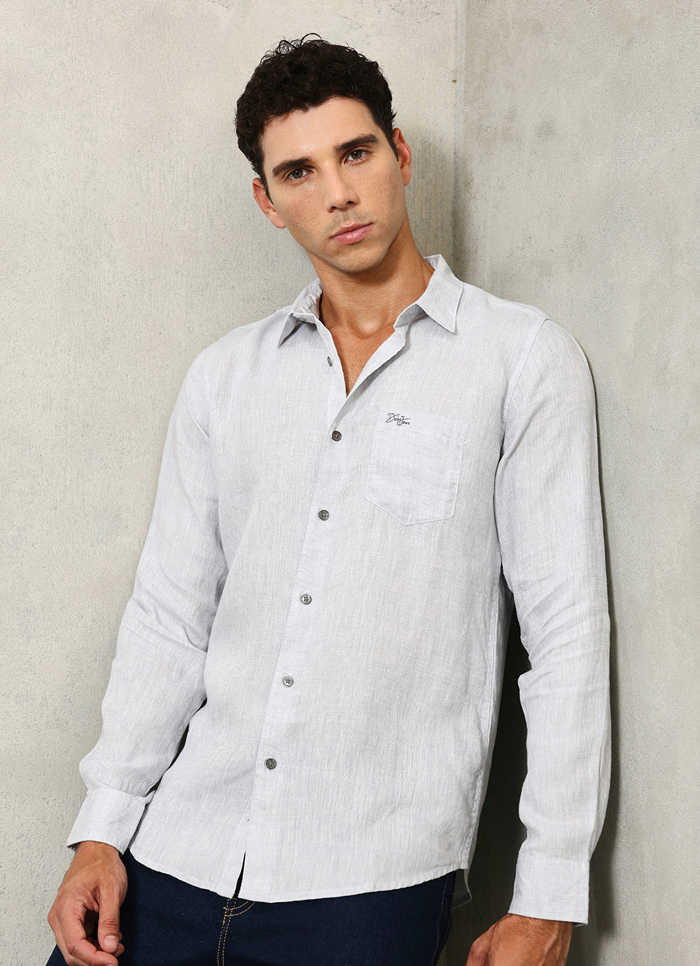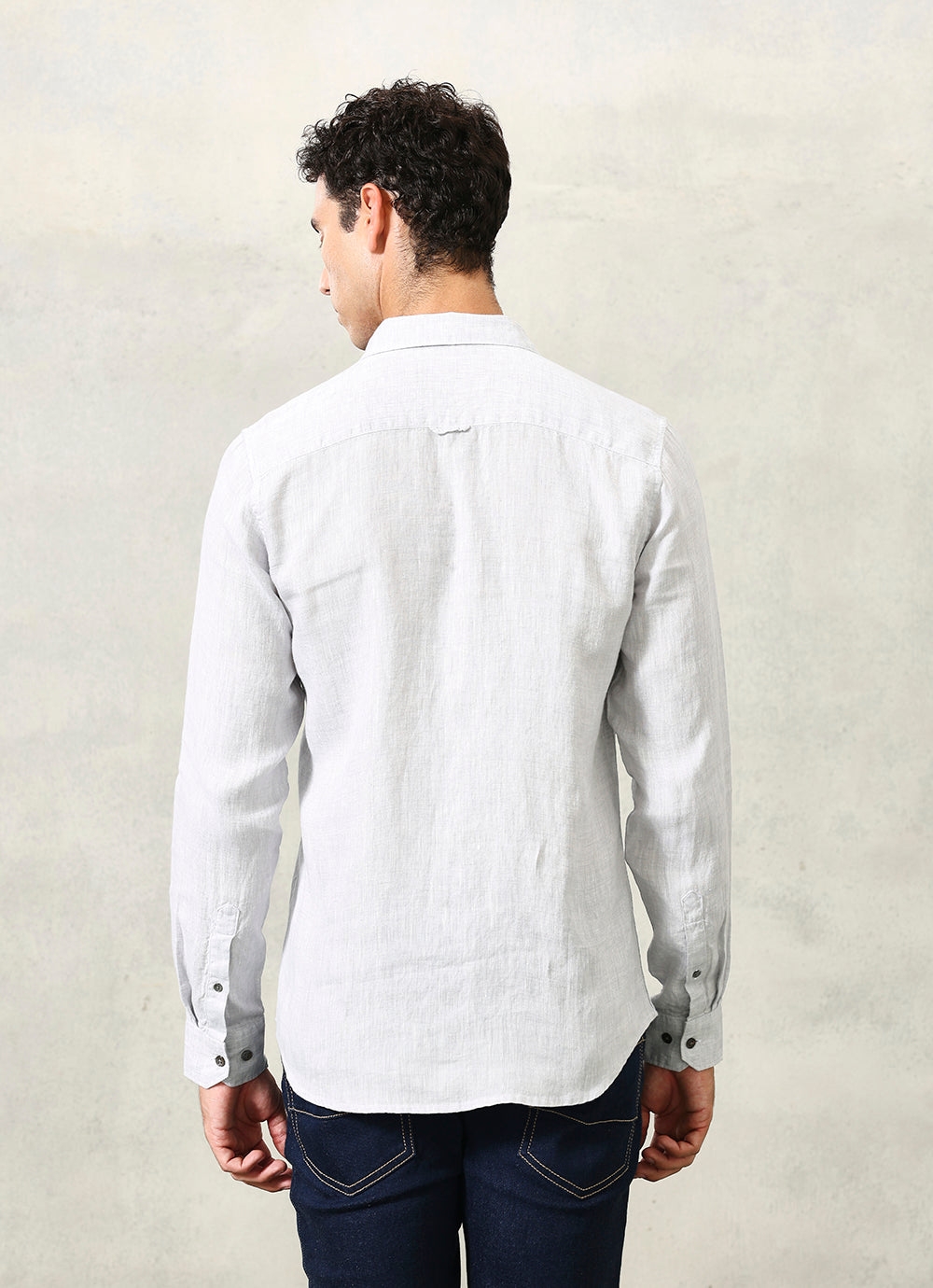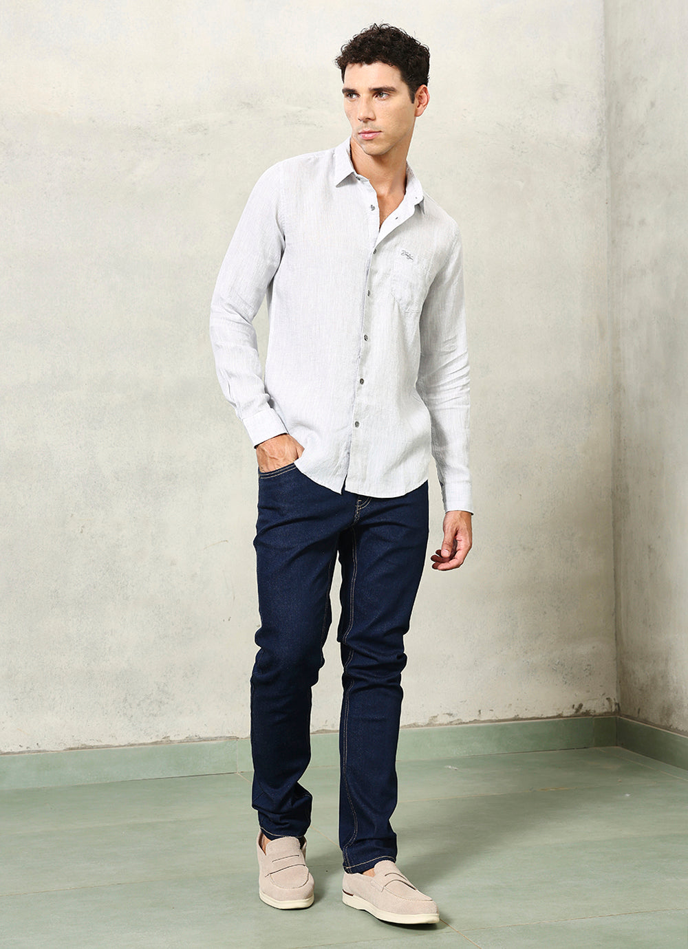 This Grey Solids Linen Slim Fit Shirt is a timeless staple designed for effortless style and breathable comfort. Crafted from premium linen, it keeps you cool and relaxed while offering a crisp, modern look. The subtle grey tone adds versatility, making it easy to pair with both casual and semi-formal outfits. The slim fit cut ensures a sharp, tailored silhouette, while the minimal branding on the chest pocket adds understated sophistication.
