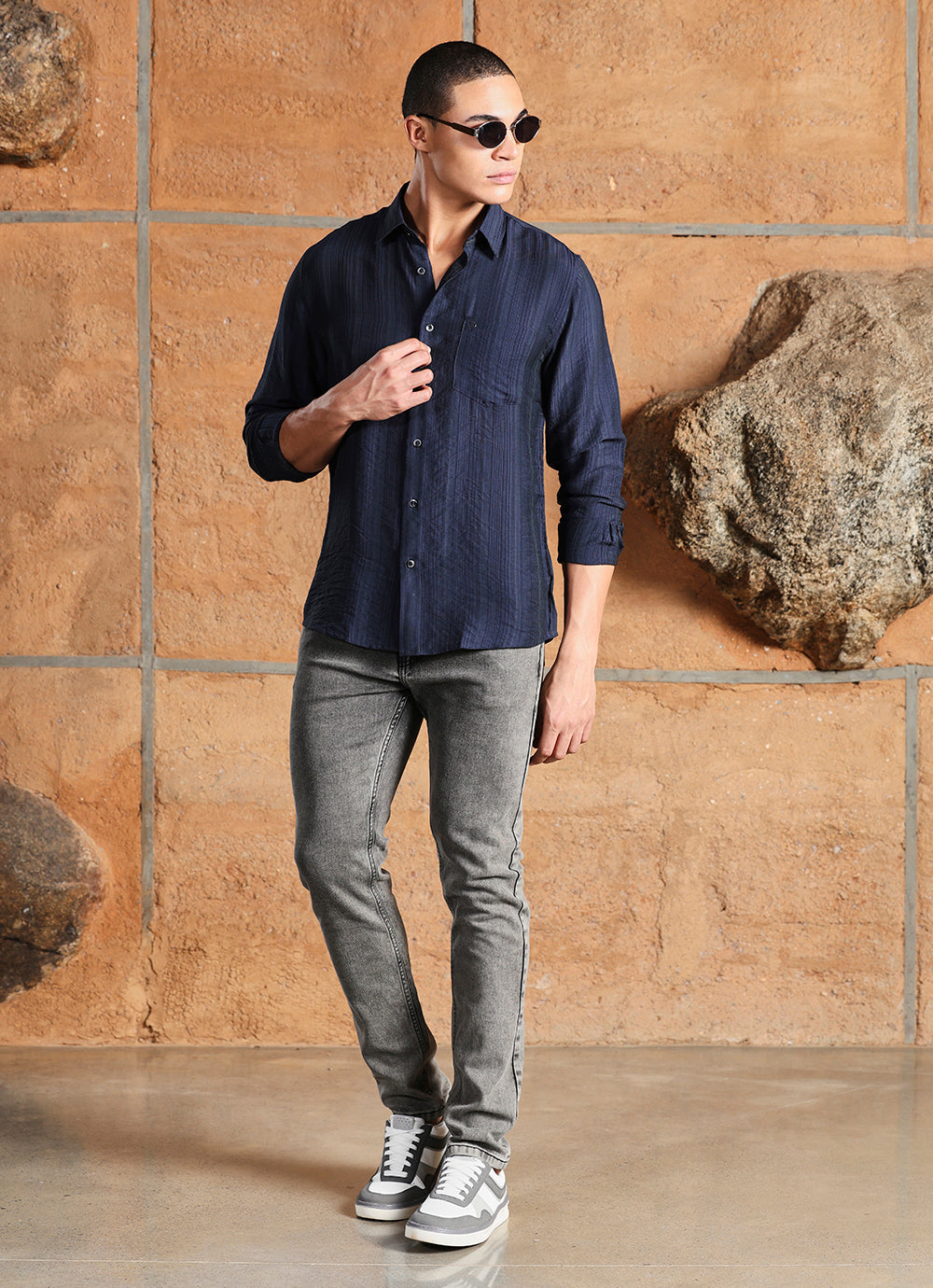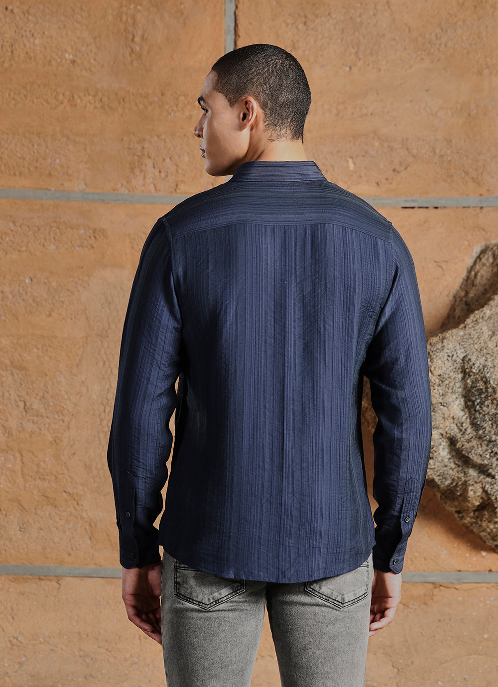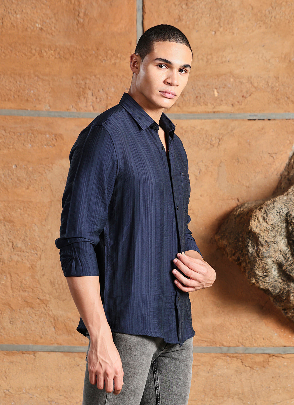 Crafted from a luxurious cotton-satin blend, this shirt combines lightweight breathability with a subtle sheen for a premium look. The textured vertical stripe pattern in rich navy elongates the silhouette, while the slim fit tailoring ensures a sharp, modern profile.