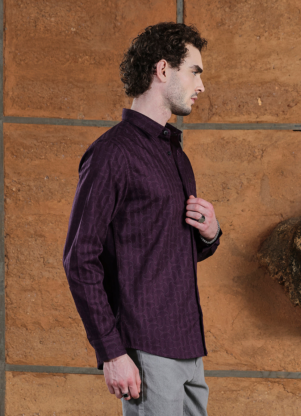 Make a bold style statement with this Purple Print Cotton Satin Slim Fit Shirt. Designed with a subtle all-over print, it blends modern aesthetics with premium satin-cotton fabric, giving a smooth feel and a polished finish. The slim fit enhances the silhouette, making it perfect for both casual evenings and semi-formal occasions.