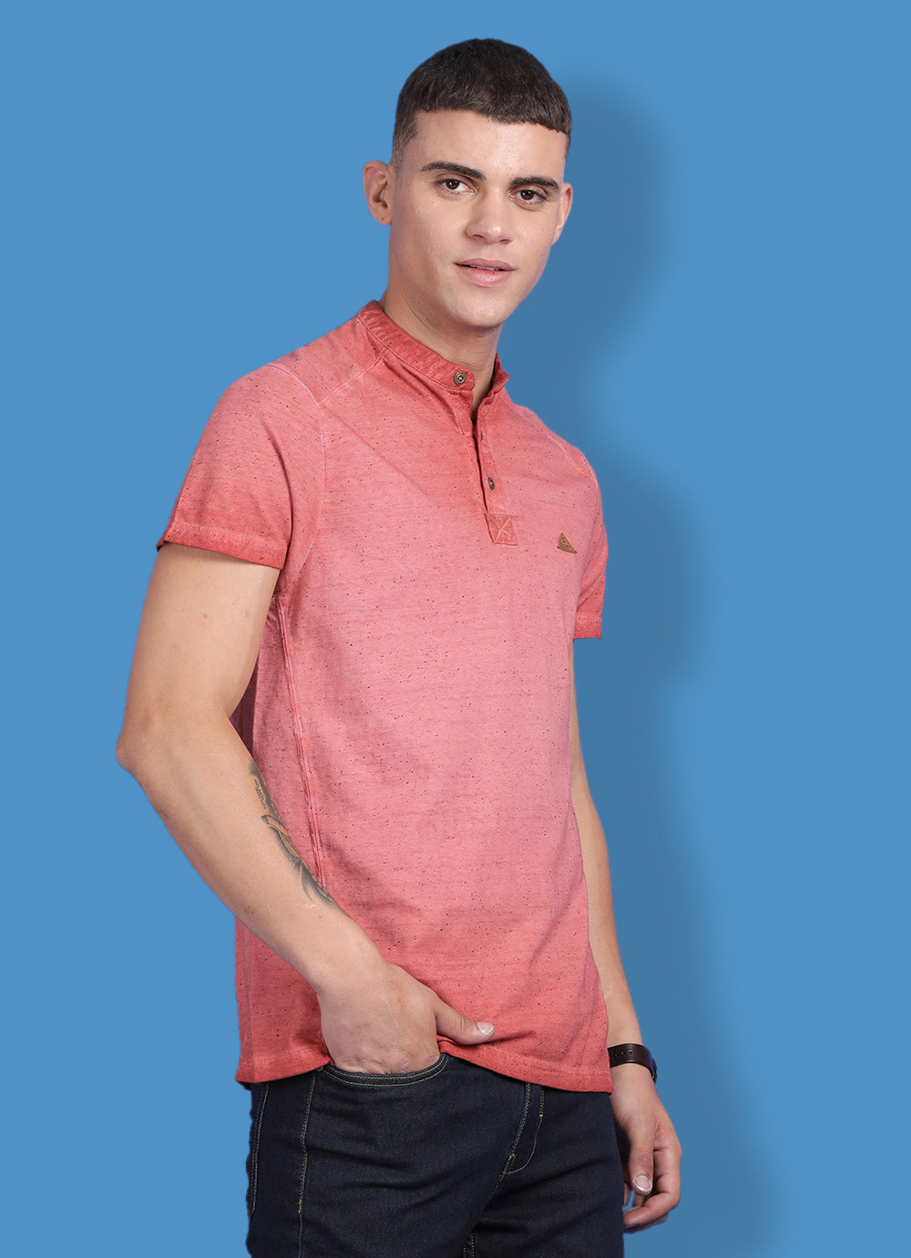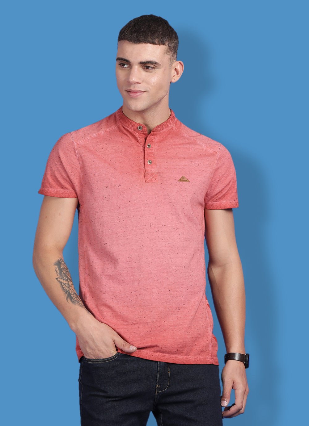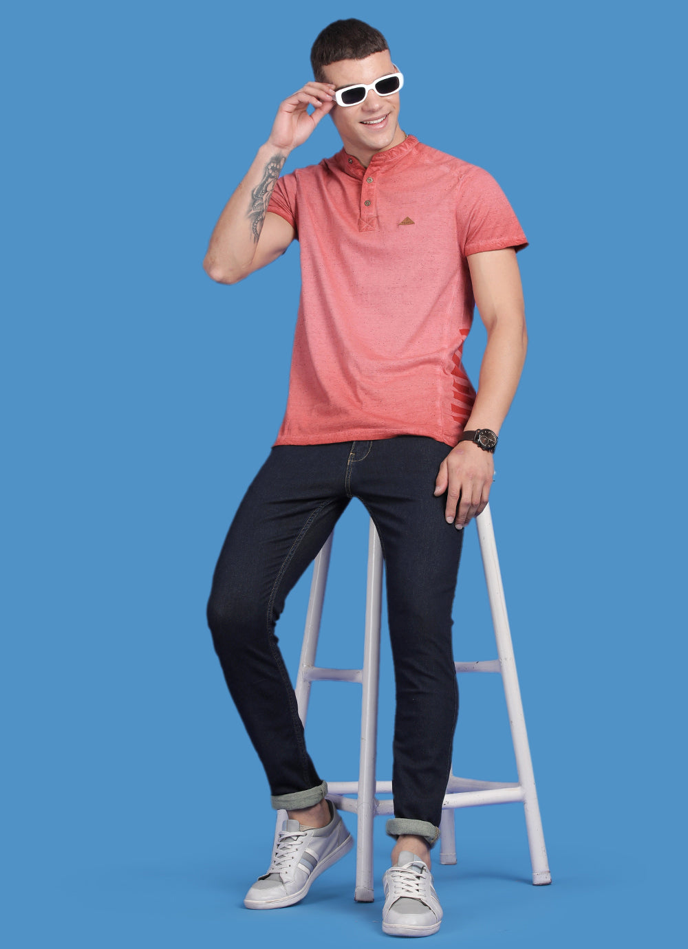 Embrace laid-back elegance with our Orange Cotton Slim Fit Henley T-Shirt. It's the epitome of casual refinement and comfort. Achieve a perfect balance between comfort and style by pairing it with well-fitted jeans and canvas sneakers. The Henley neck adds a touch of character to your relaxed, weekend look.